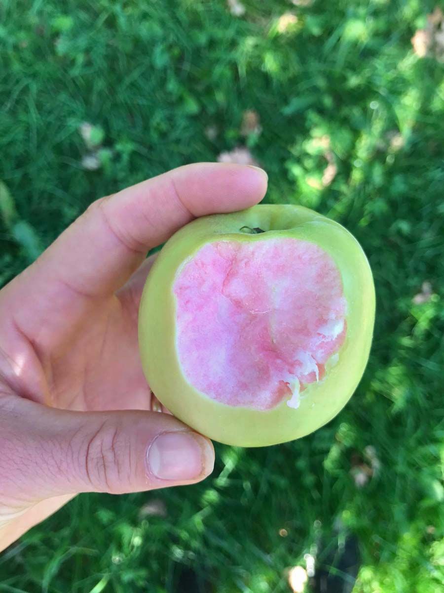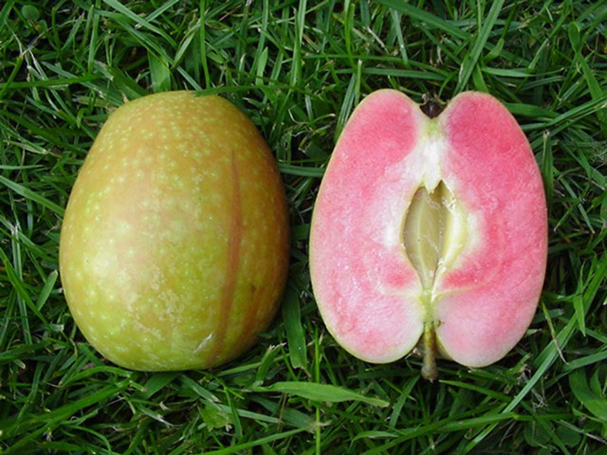 Description: Hidden Rose is tart with a subtly sweet taste and a flavour that has been likened to strawberry lemonade. The apple's internal colour is vibrant pink to red and the flesh is crisp and juicy. Green/yellow skin with a pink/orange blush. Hidden Rose is less susceptible to scab than other varieties. Pick in October and keeps well until January-February.