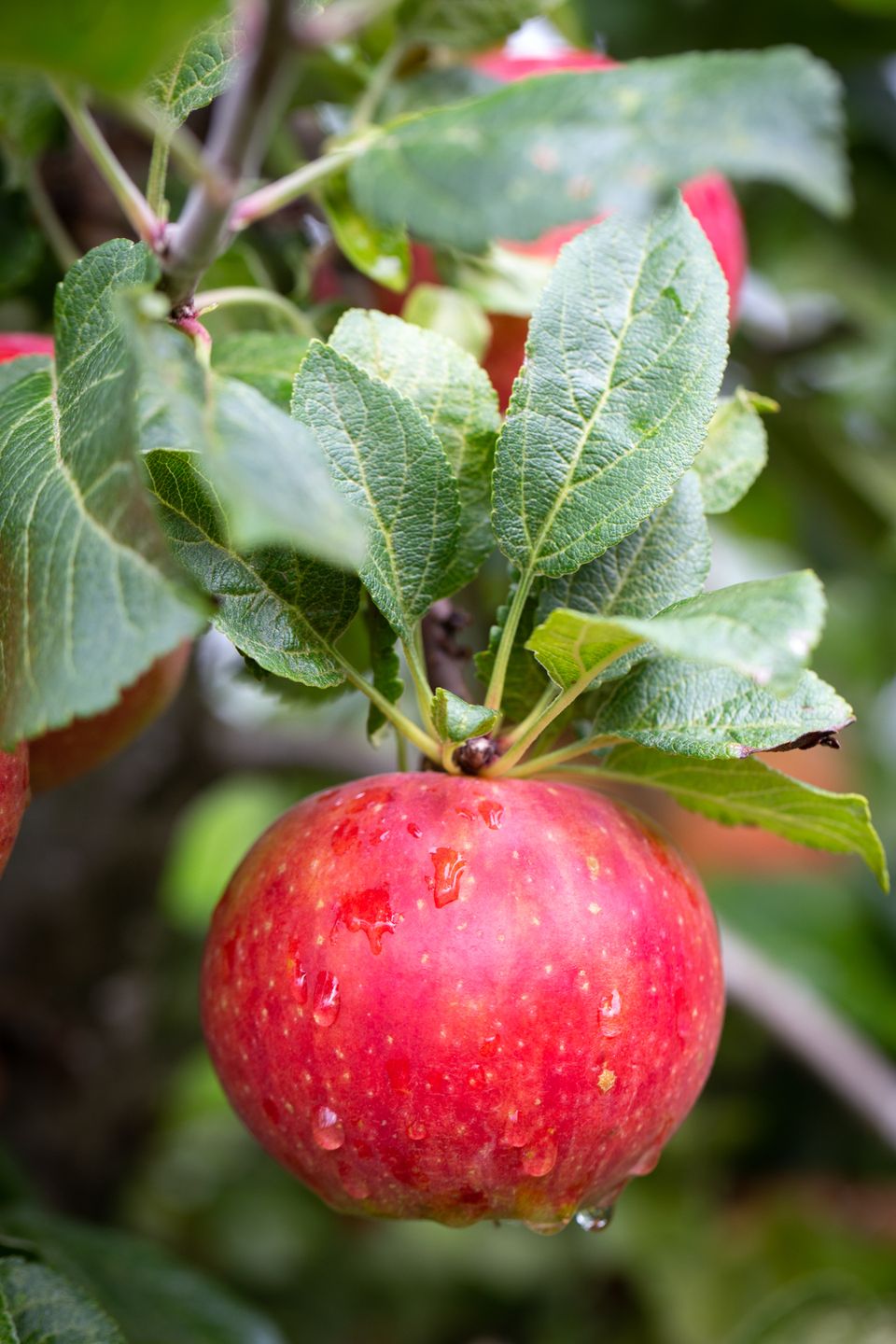 Bright red fruit, aromatic, crisp, sweet flavour. Thin skinned. Self fertile, frost hardy. A children's favourite.
