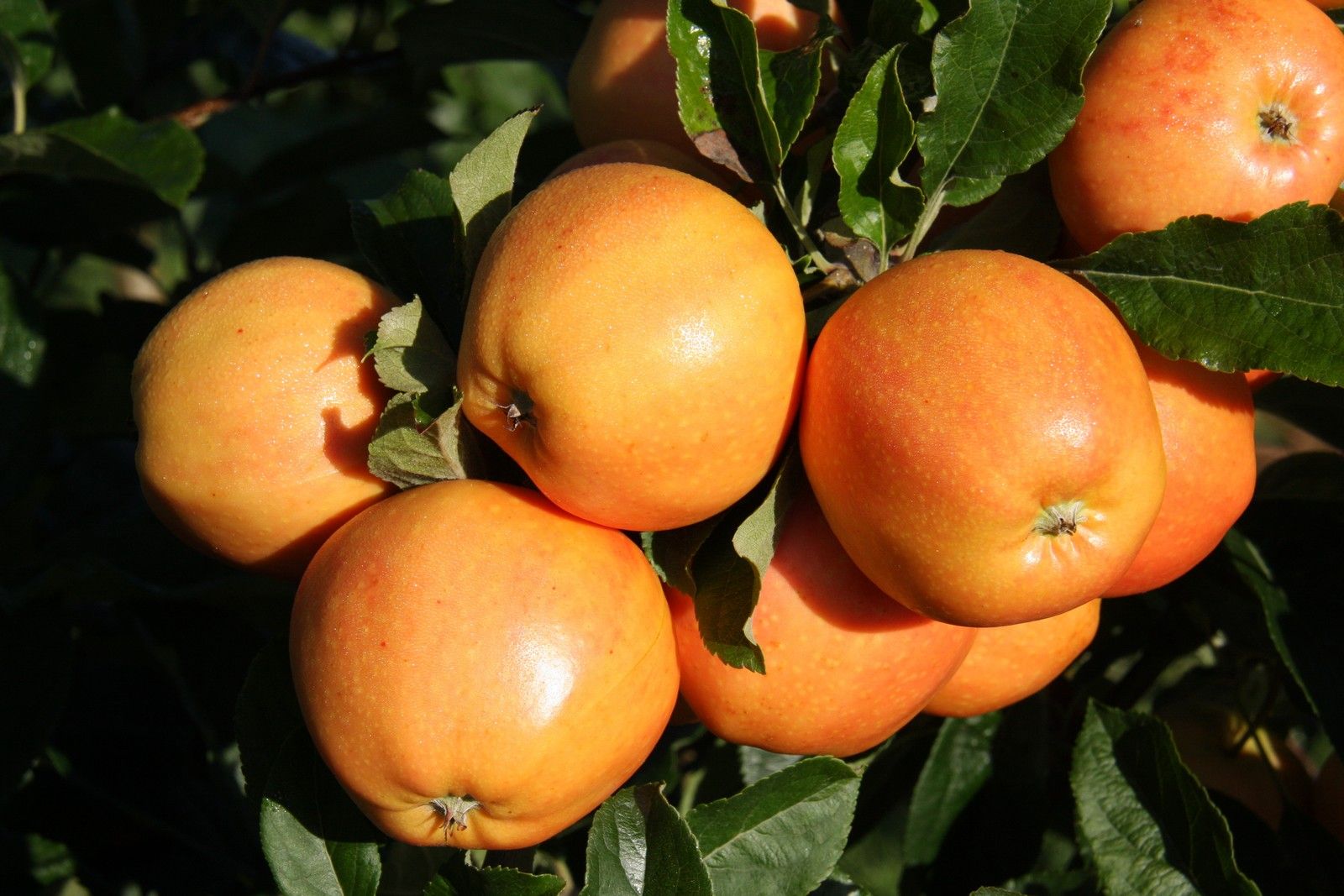 Golden apples with occasional pink flush. Flesh is firm, sweet and dense with a good crunch.