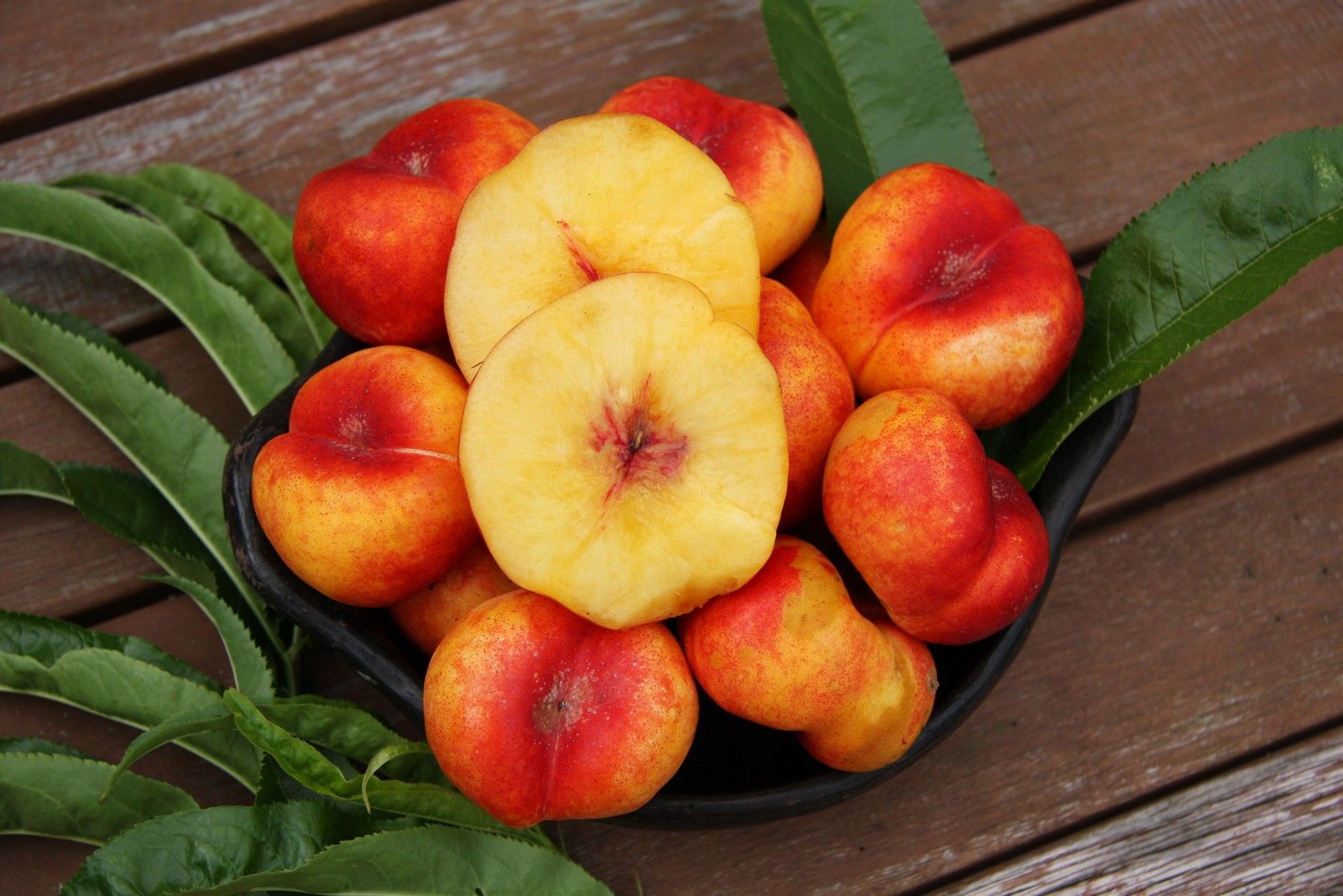 A dwarf nectarine of very good quality. Sweet orange-red flesh and a freestone. Ideal for pot growing.