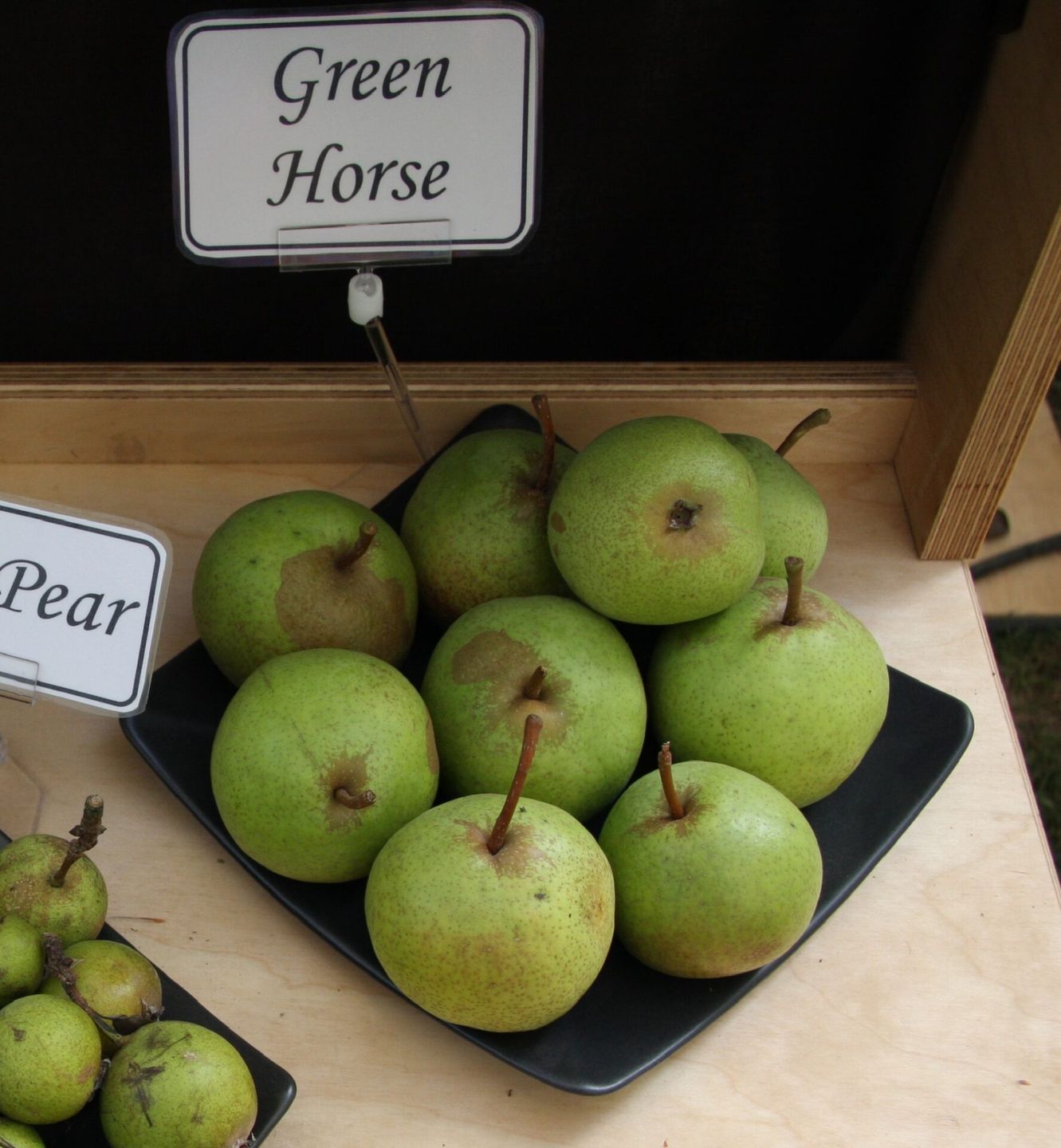 Description: Green Horse is a very old perry pear variety. Attractive olive green-yellowish fruits with orange flush. Makes a high acid, low tannin perry of good quality. They can also be stewed or pickled. Beautiful clusters of white spring flowers. Green Horse is found widely grown in many orchards in the Gloucestershire area.