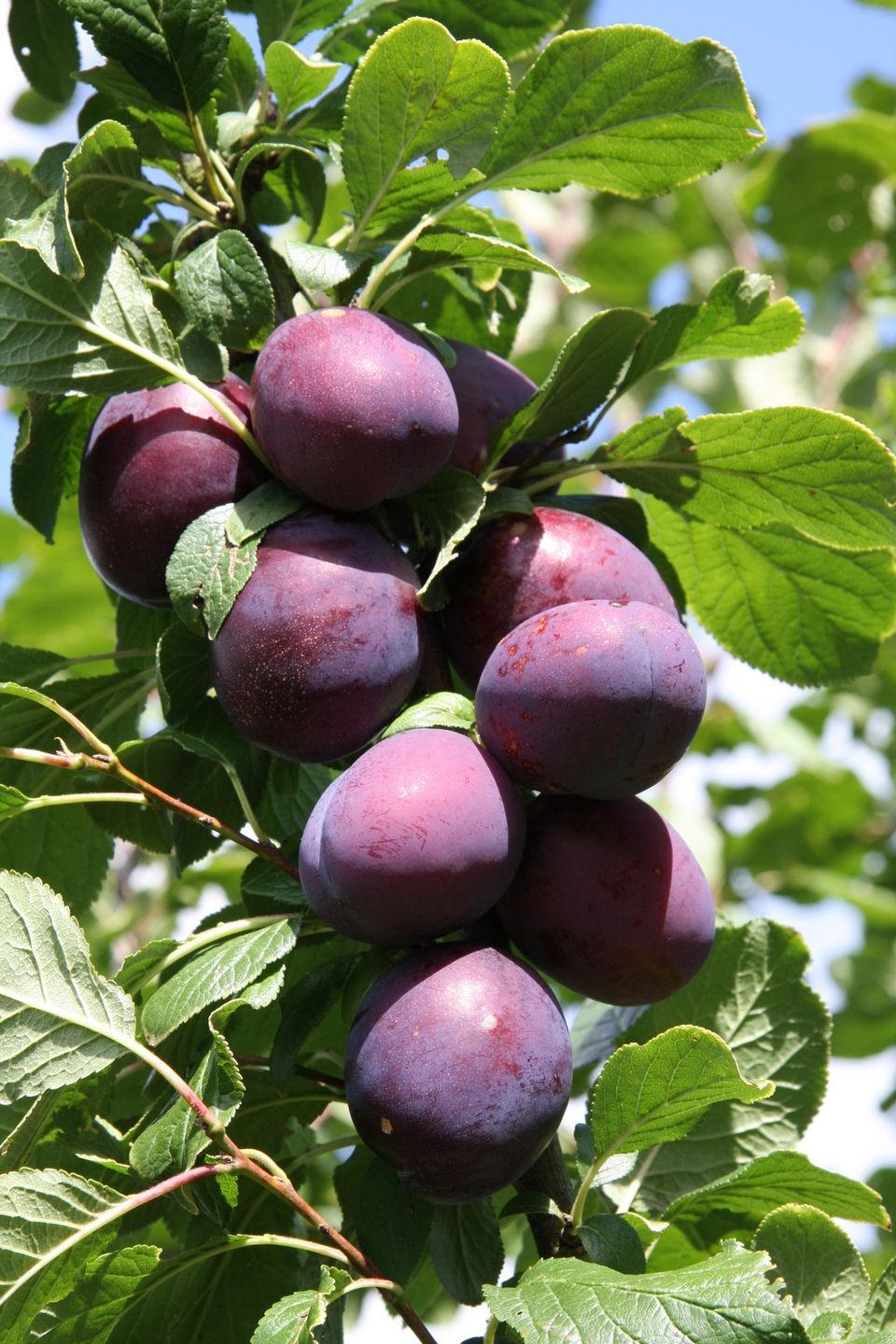 Large, blue plum, strong scented with excellent flavour. Keeps well. Partially self-fertile. Freestone.