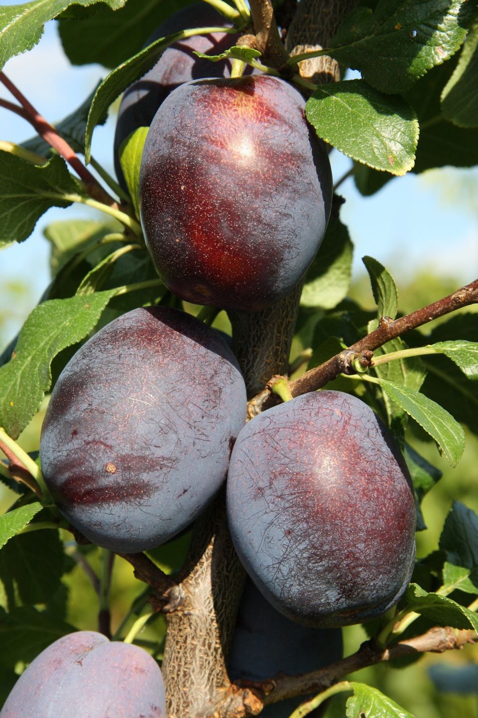 Large, blue plum, strong scented with excellent flavour. Keeps well. Partially self-fertile. Freestone.