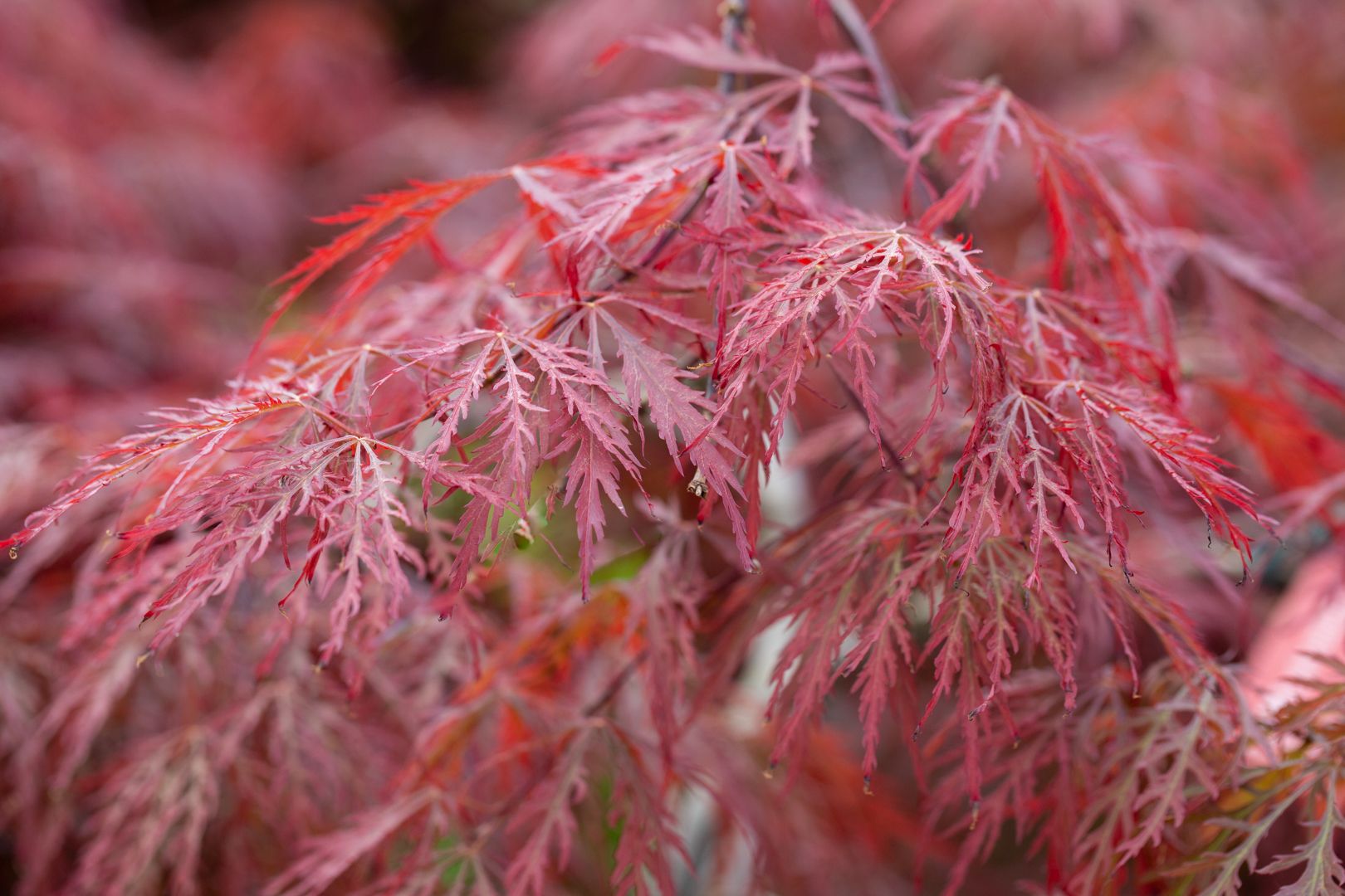 Crimson-red dissected leaves which unfold to an excellent tone of dark purple, holding well throughout summer.