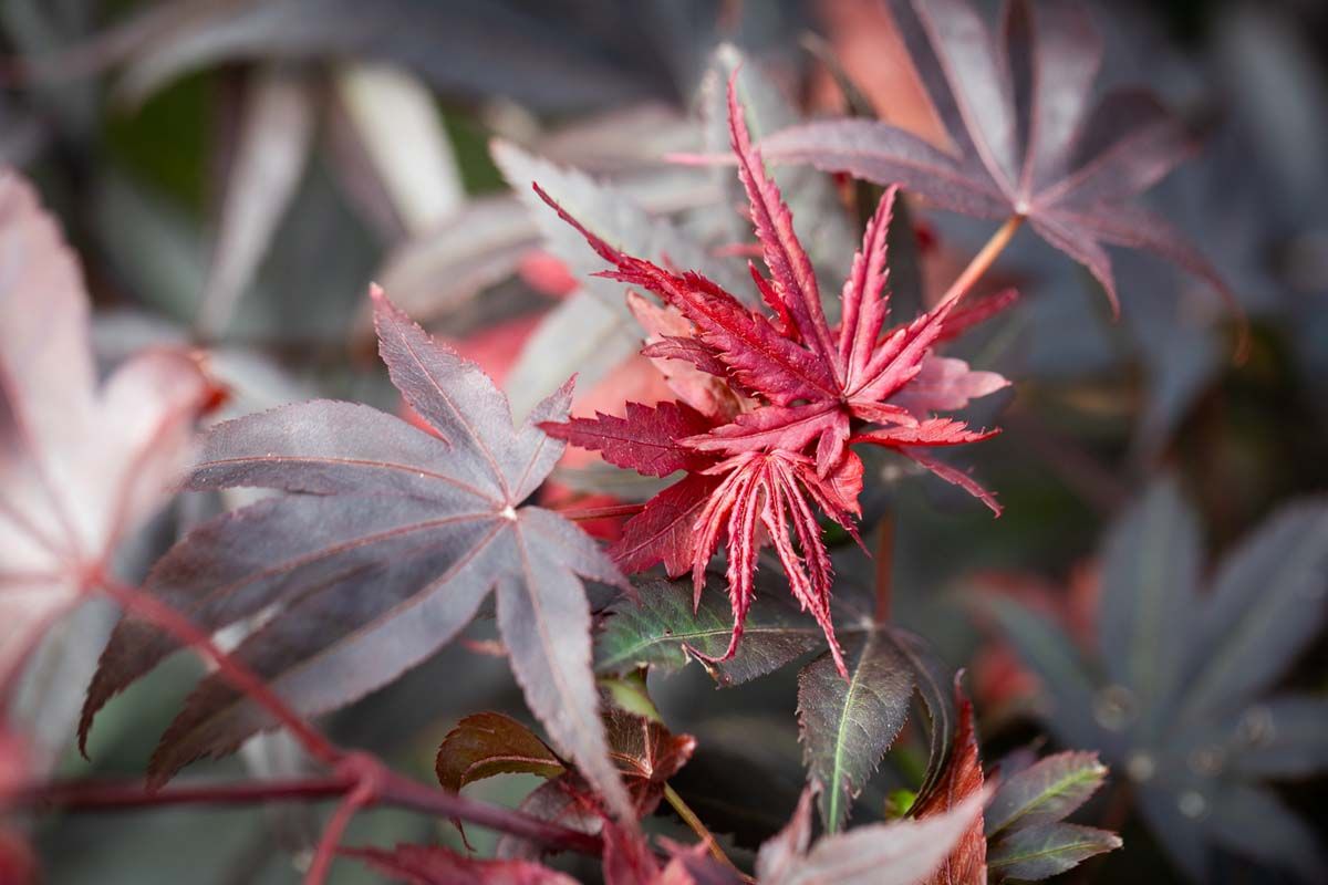 Crimson-red dissected leaves which unfold to an excellent tone of dark purple, holding well throughout summer.
