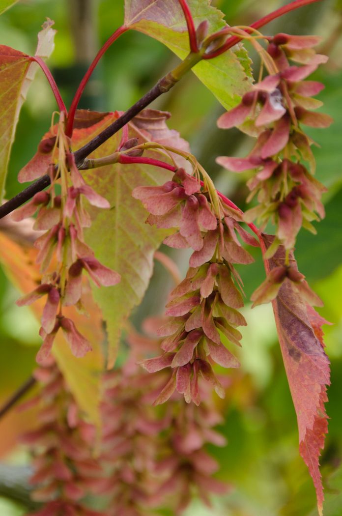 Lime green flowers tinged red in April followed by large, intense purple leaves turning orange in autumn.