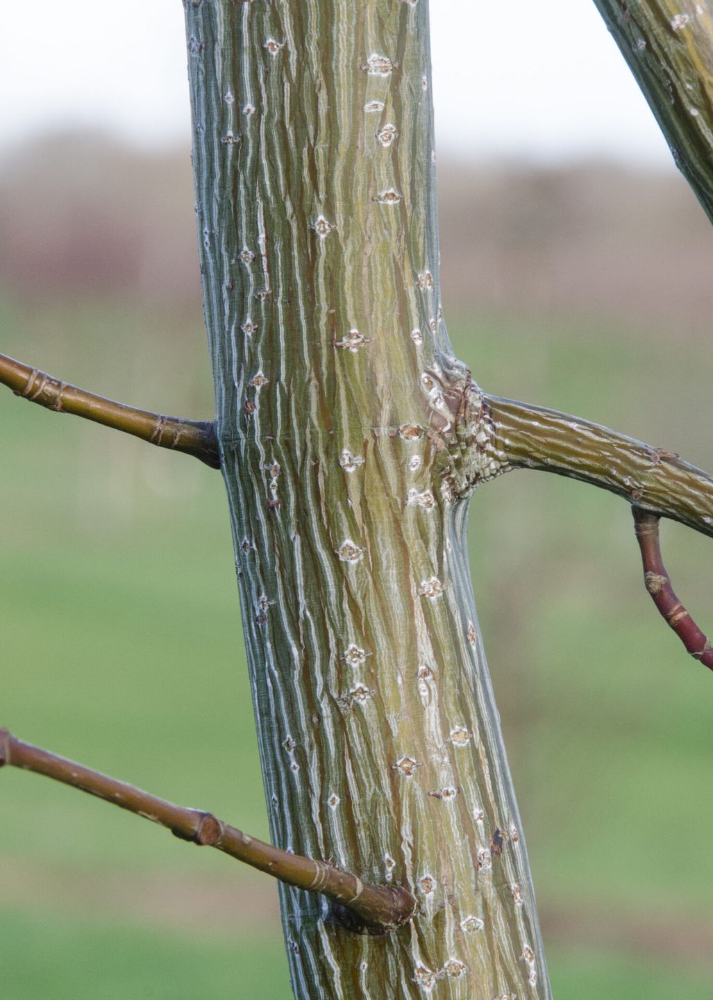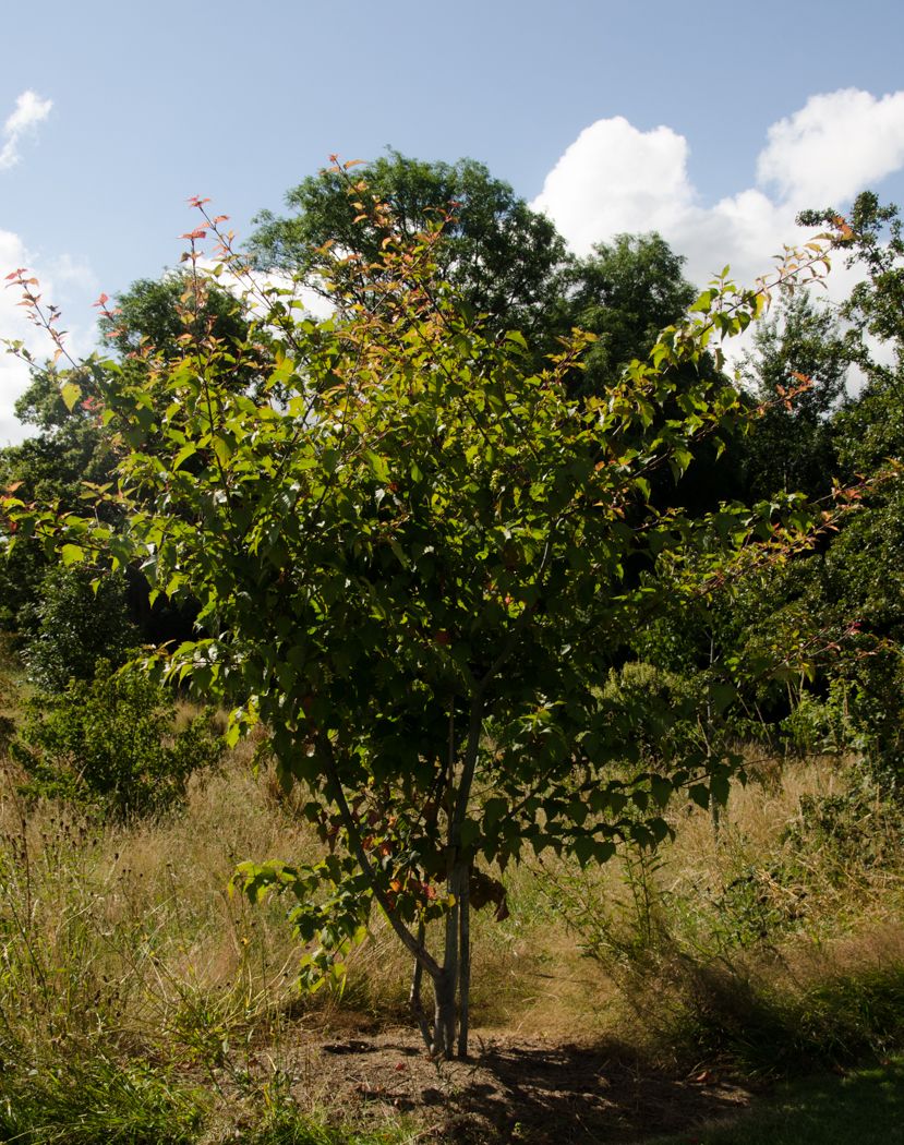 Young growth coral red, green then reddish-orange in autumn. Yellow flowers, striated bark and pink fruits. Read more