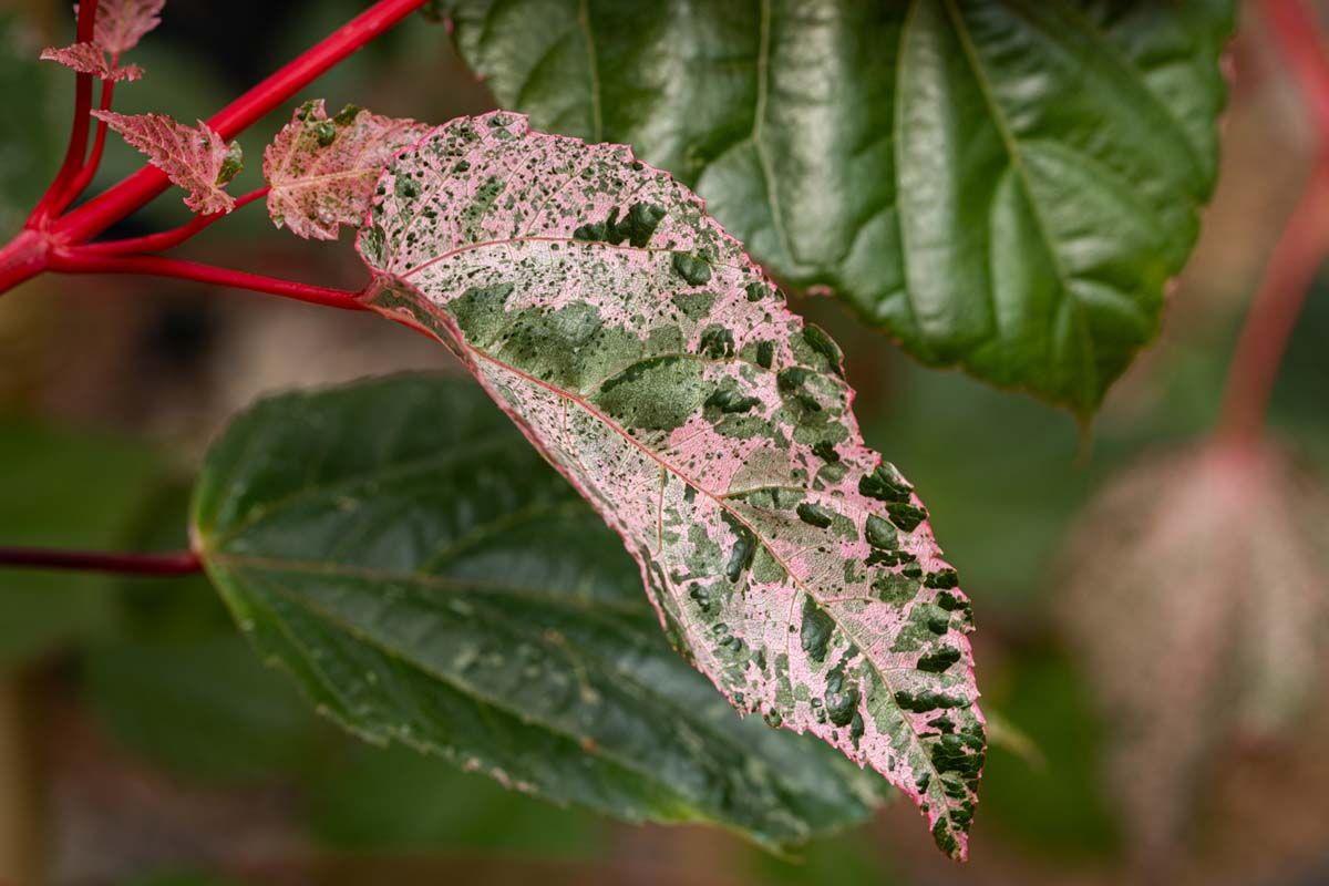 Young leaves have a broad, soft pink salmon coloured margin change to white. Attractive grey-white stems.