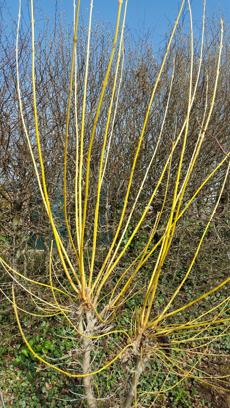 Bushy headed tree with bright gold and yellow winter stems. Bright green summer foliage turns gold in autumn. Read more