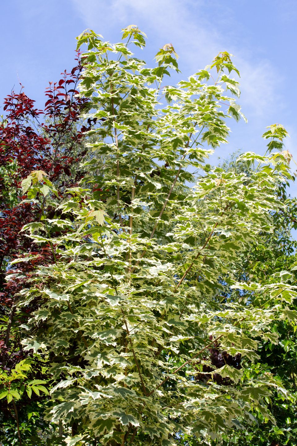 A popular garden tree. Globe-headed with green leaves and striking white marginal band. Yellowish autumn colour. Read more