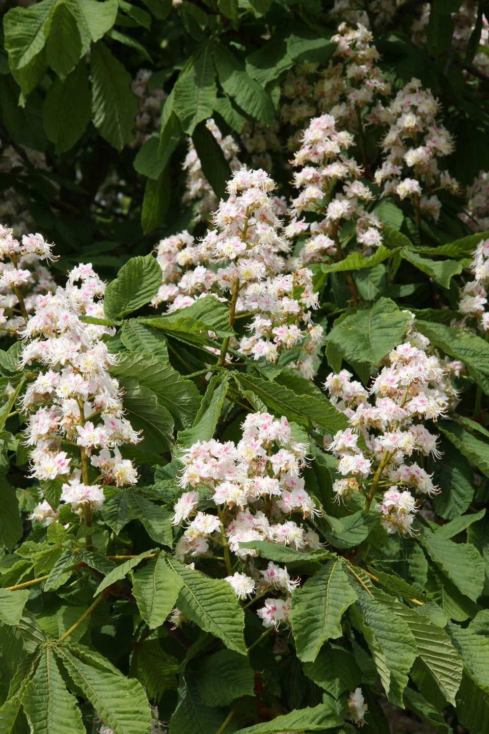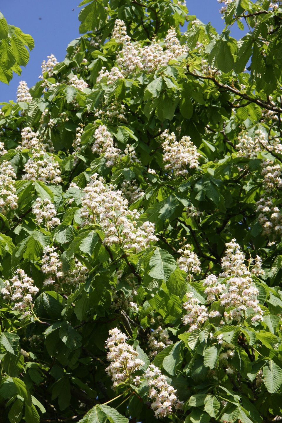 Sticky buds, large palmate leaves, yellow/orange in autumn. White 'candle' flowers. Green husks with conkers. Read more