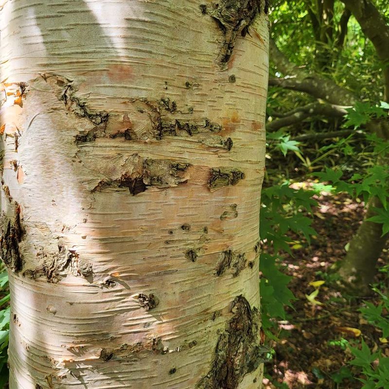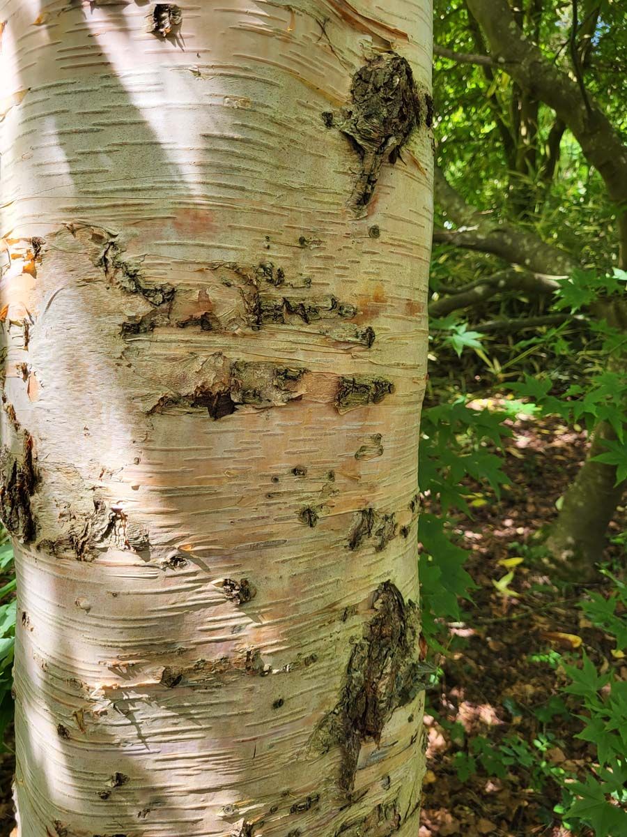A strong growing birch with a gorgeous dark mahogany, peeling bark, similar to 'Darkness'.