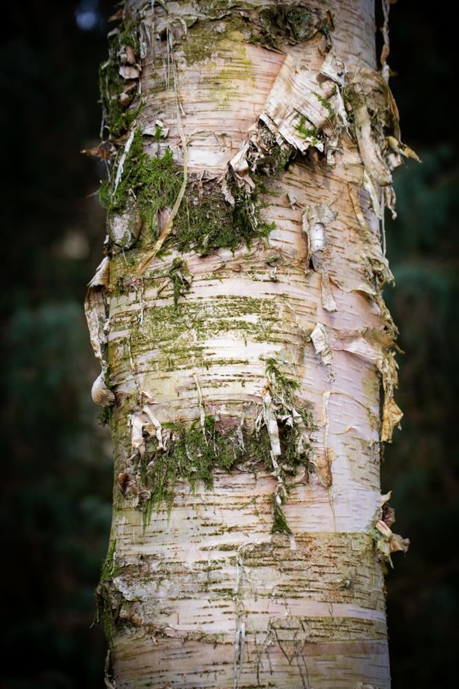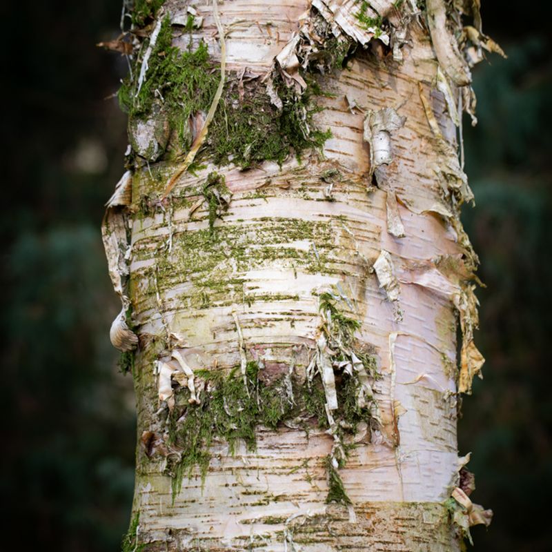Striking white bark and drooping dark leaves. The peeling white bark is highlighted with silvery-grey hue.