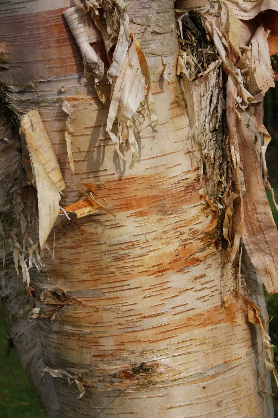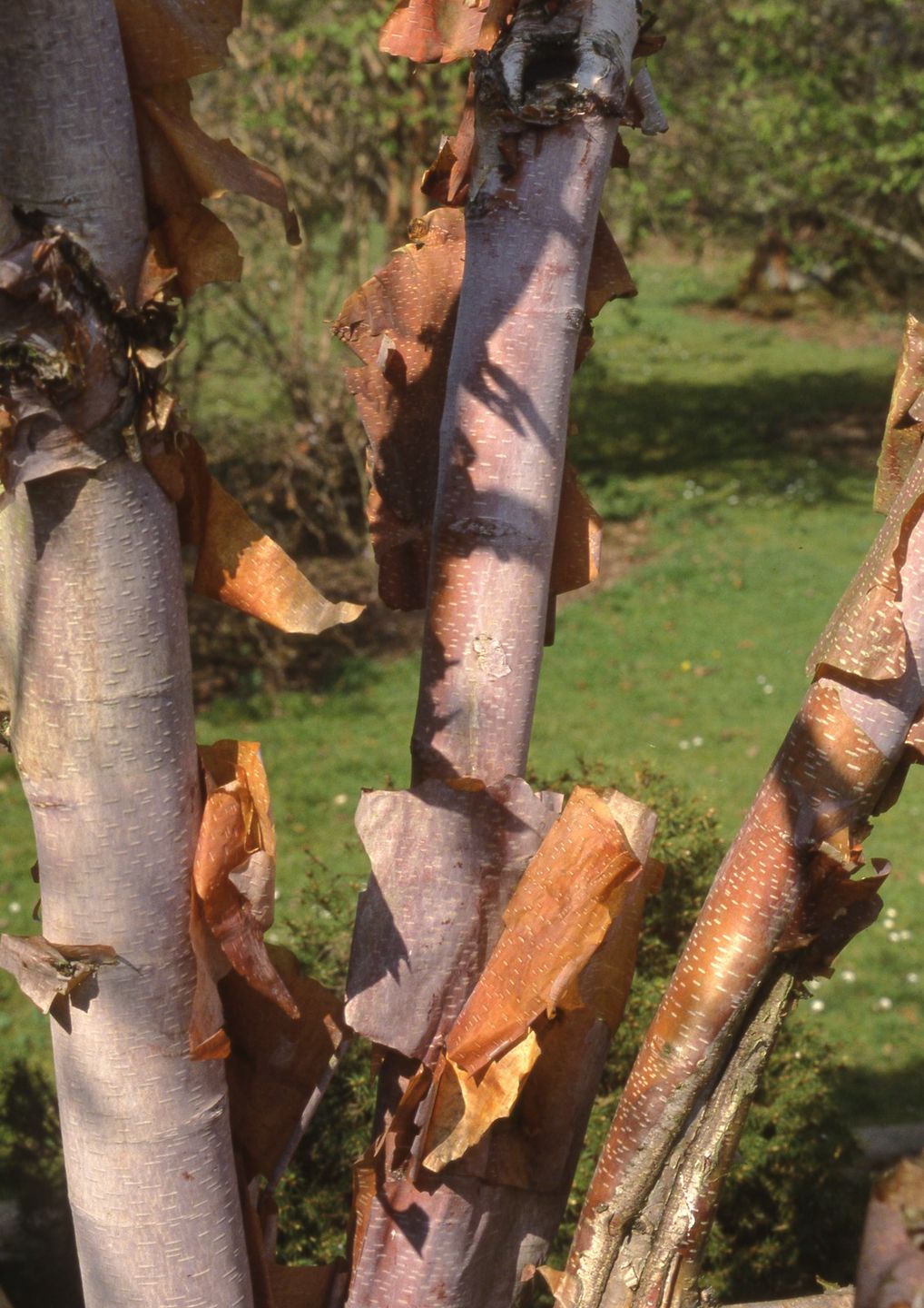 Dark purple and orange, peeling bark and prominent horizontal lenticels. The mid-green leaves turn yellow-orange in autumn.