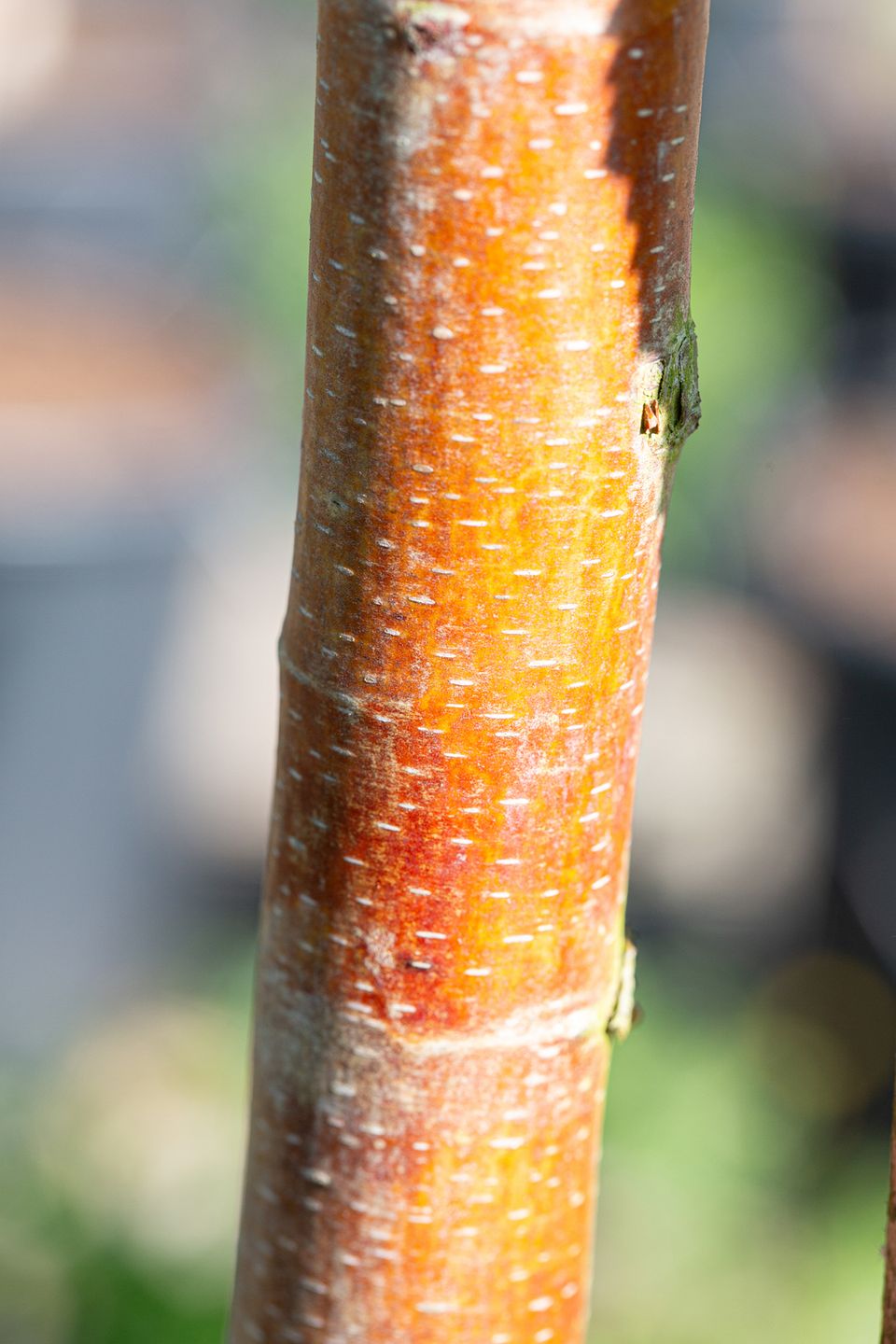 Stunning dark red-brown, cinnamon coloured, peeling bark from an early age. Catkins are produced in spring.