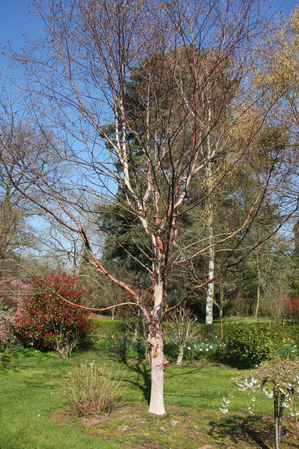 Wonderful light pink bark which peels attractively with age. Â A narrow neat, upright habit.