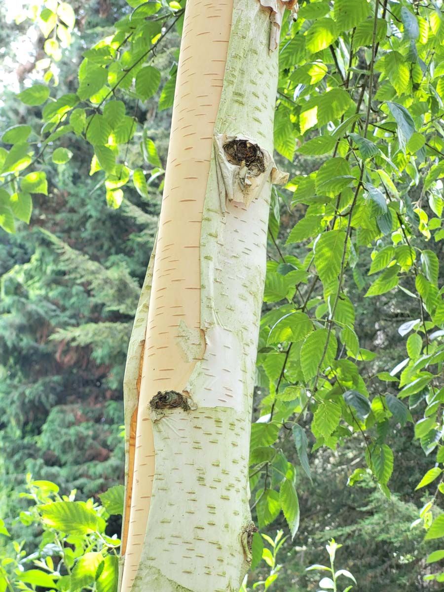A strong growing birch with a gorgeous dark mahogany, peeling bark, similar to 'Darkness'.
