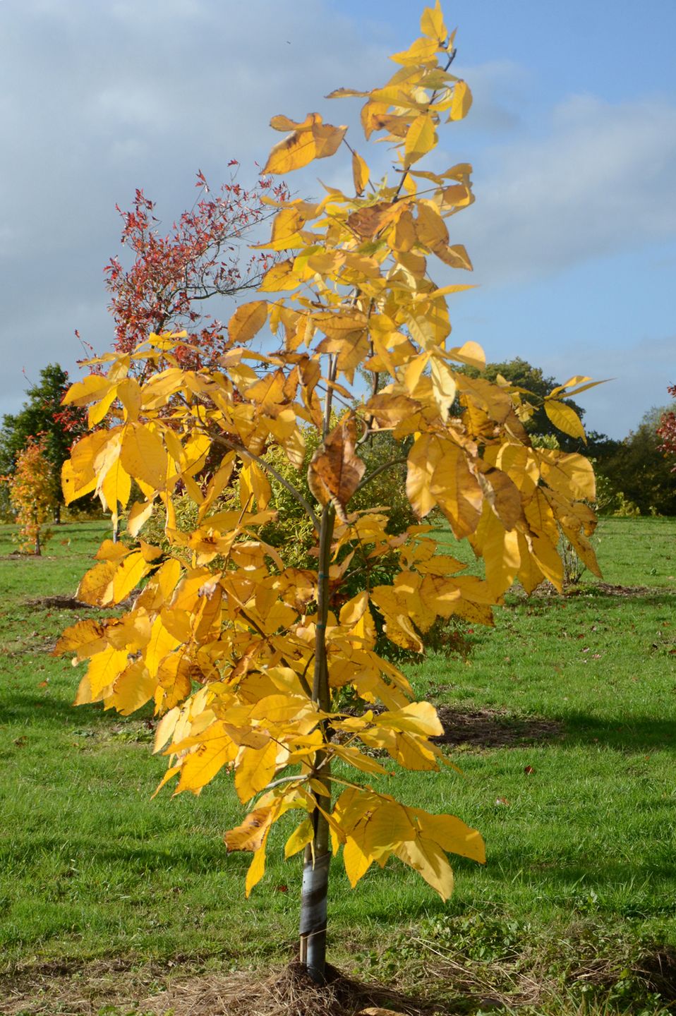 Ornamental, peeling bark. Large leaves turn golden yellow in autumn. Flowers in spring followed by thick-shelled nuts. Read more
