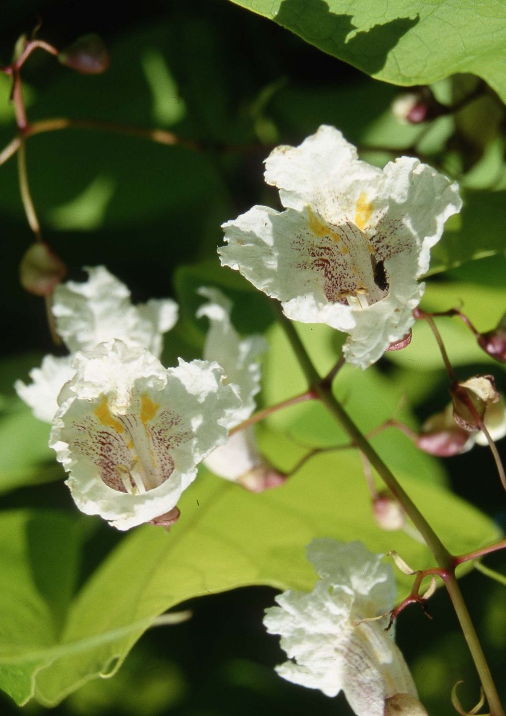 Panicles of trumpet-shaped pale pink flowers, with brown and orange-spots. Large, pointed leaves tinged bronze in spring