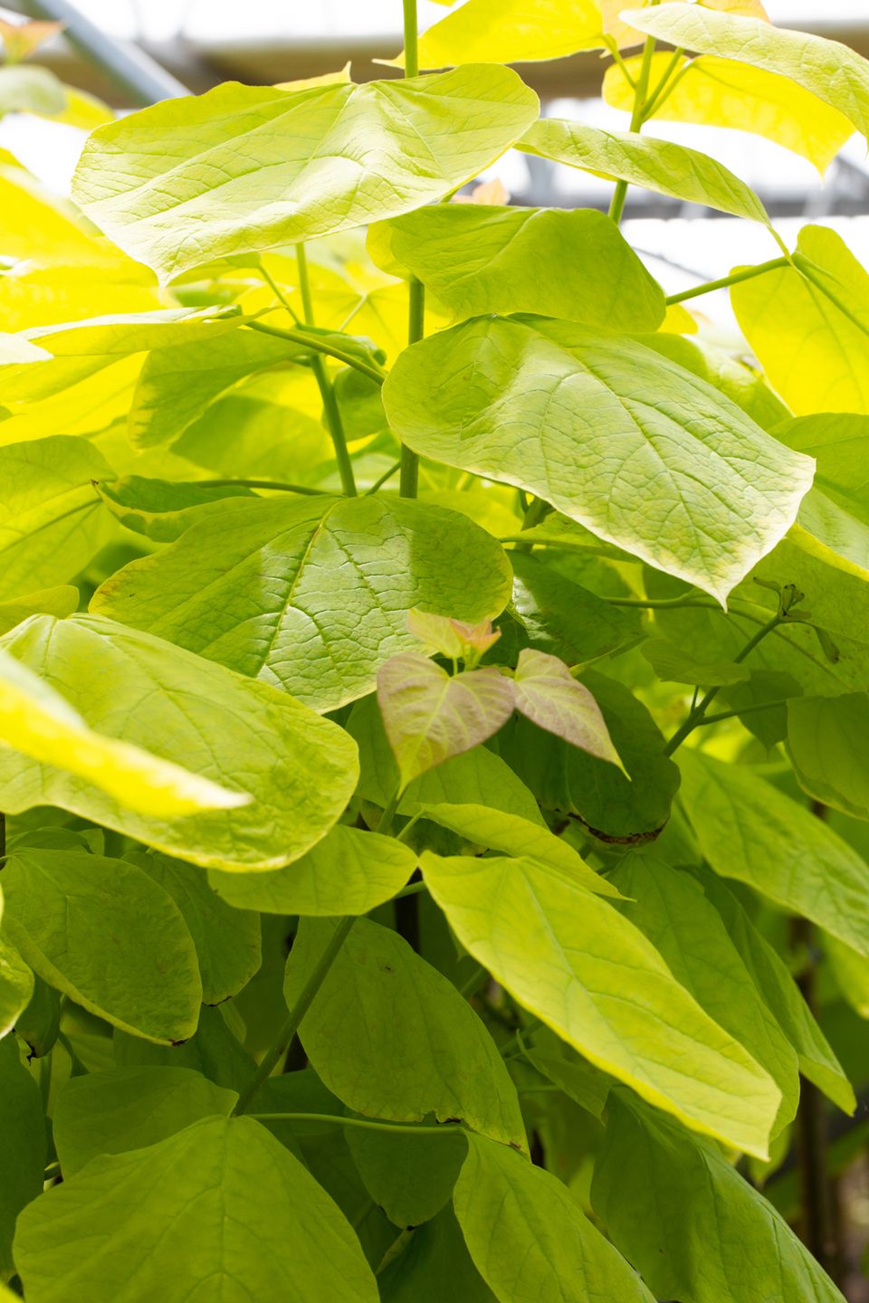 Description: Catalpa big 'Aurea' also known as Golden Indian Bean Tree has a low spreading habit with a domed crown. Large heart-shaped golden velvety leaves fade to green. Panicles of white flowers similar to Catalpa bignonioides although less profuse. There is also a more dwarf form Catalpa bignonioides ‘Aurea Nana’.