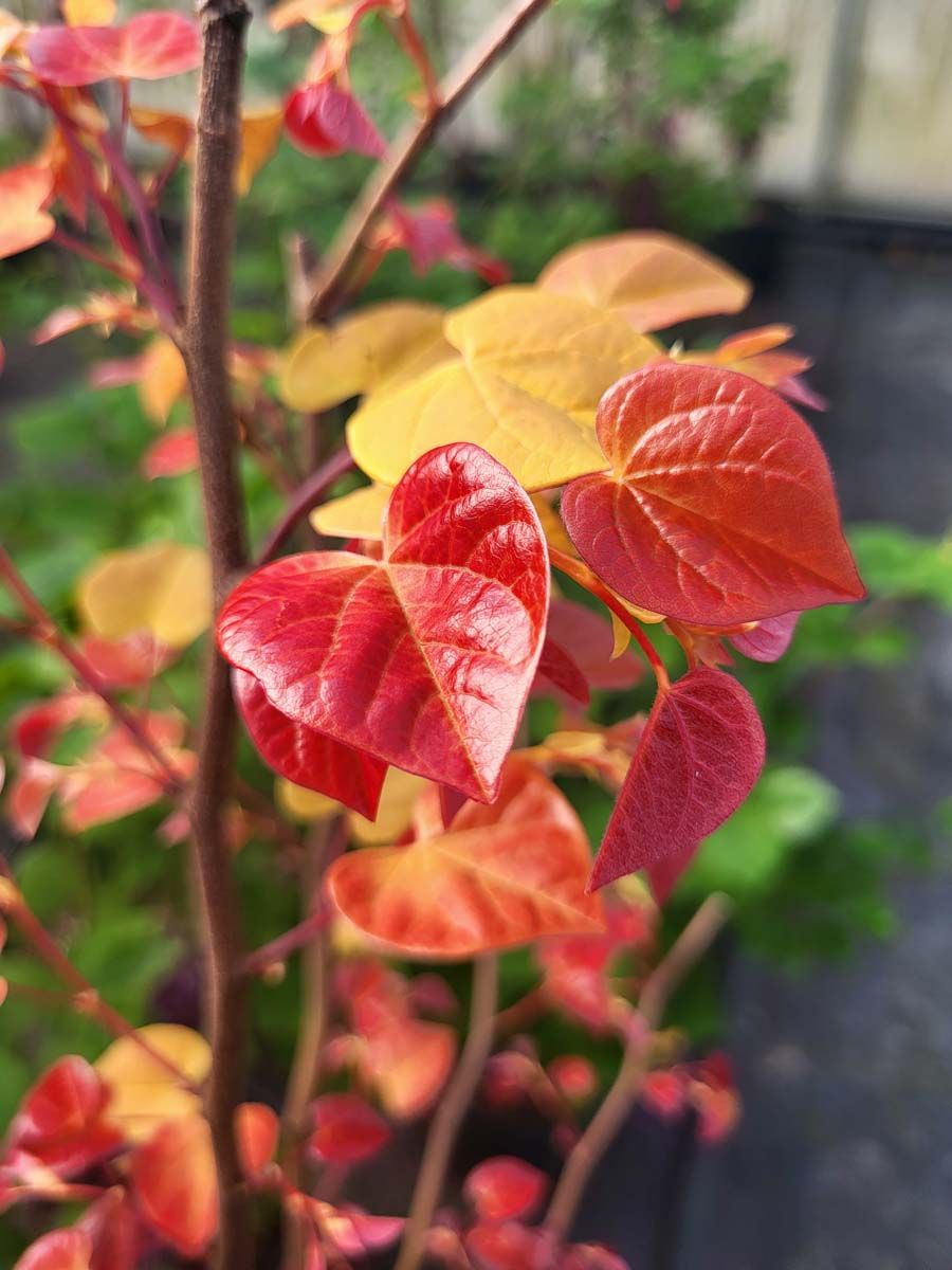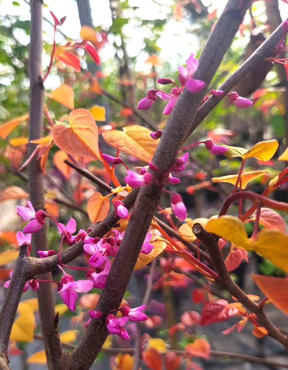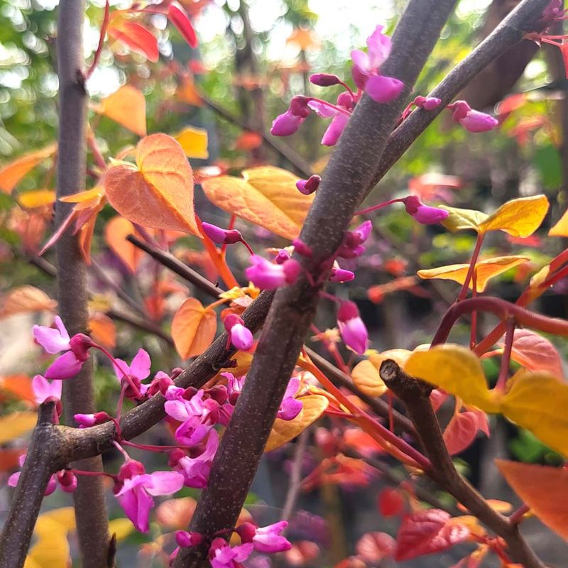 Description: Cercis canadensis 'Hearts A'Fire'™ is a striking small tree or large shrub ideal for small gardens. Clusters of vivid pink pea-like flowers cover the bare branches in spring. Heart-shaped foliage emerges burgundy, orange, and golden yellow, maturing to a warm red green in summer. Seed pods add some winter interest and food for birds.