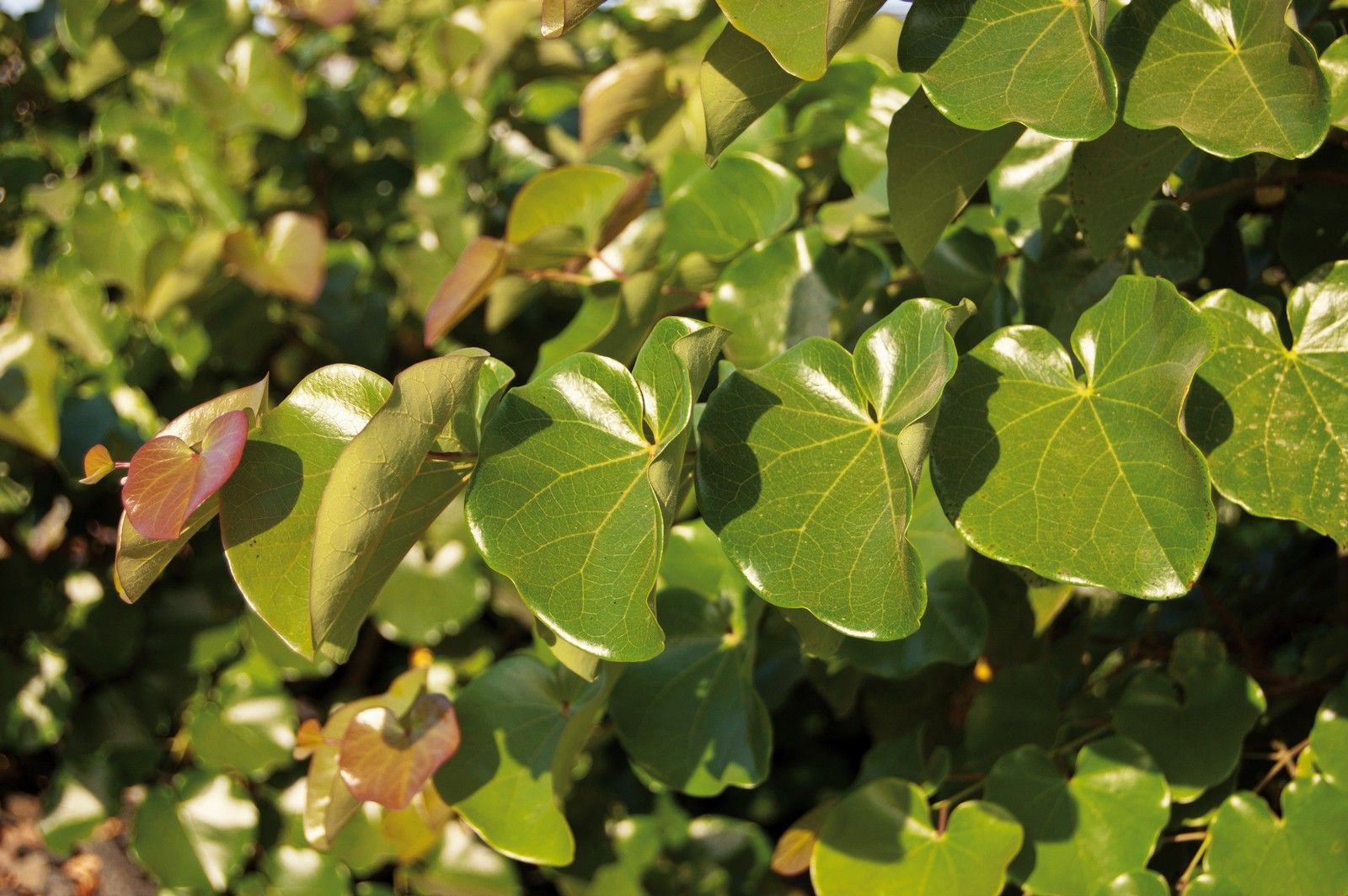 Steeply pendulous small tree with glowing, golden yellow, heart-shaped leaves. Pink flowers in April/May.