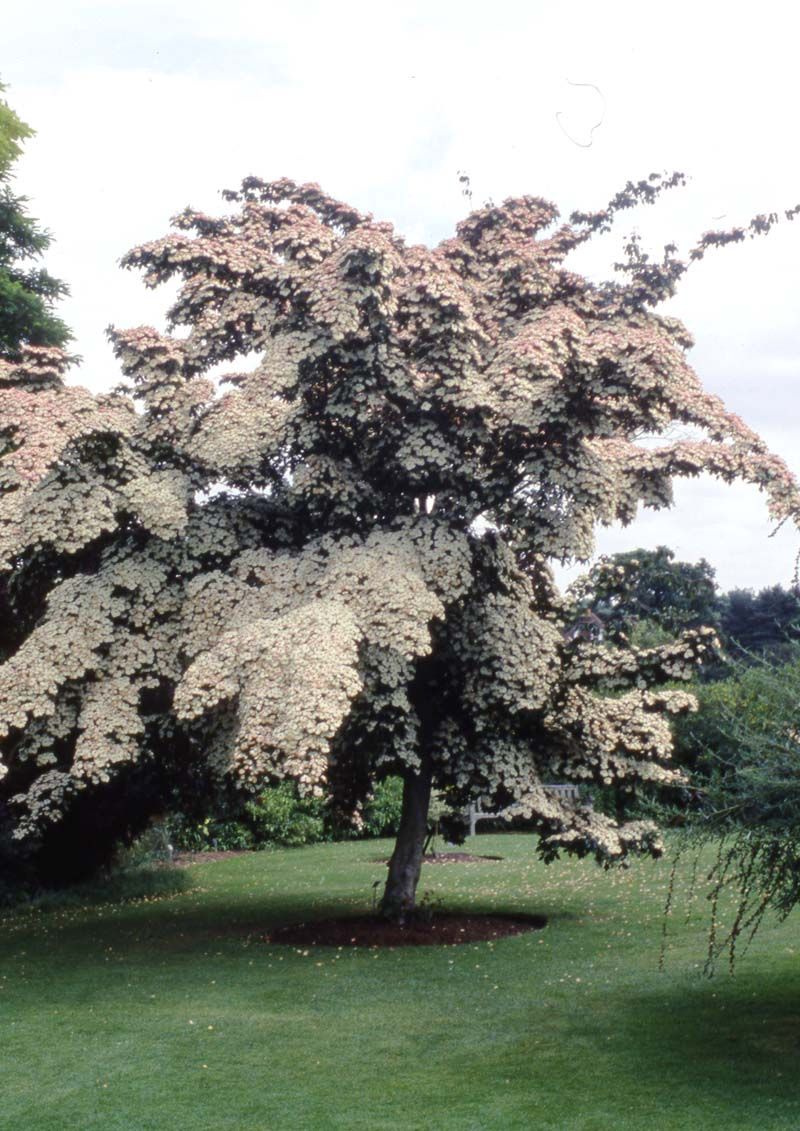 Large creamy white bracts turn pale pink as it ages followed by red fruits in late summer. Purple-red autumn colour.
