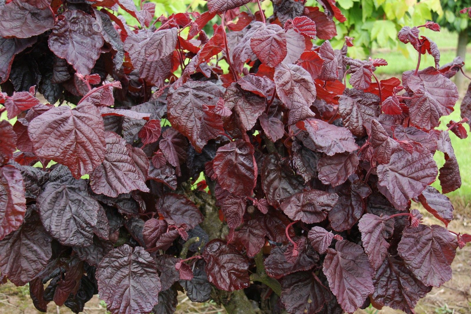 Leaves retain their dark purple/red colour through summer and into autumn. Edible nuts in autumn.