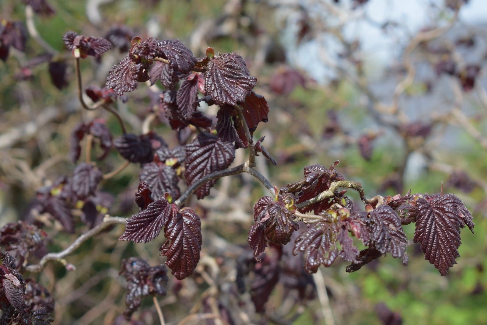 Description: Corylus ave 'Red Majestic' is a rare and unusual red leaved form of the contorted twisted stem hazel. This compact, deciduous shrub provides structure and colour throughout the year. Deep plum-purple foliage in early summer, becoming green tinted as the leaves mature, then bright purple in autumn, before falling to reveal an exquisite jumble of curiously twisted stems. Pink/purple catkins decorate the tree in late winter and early spring.