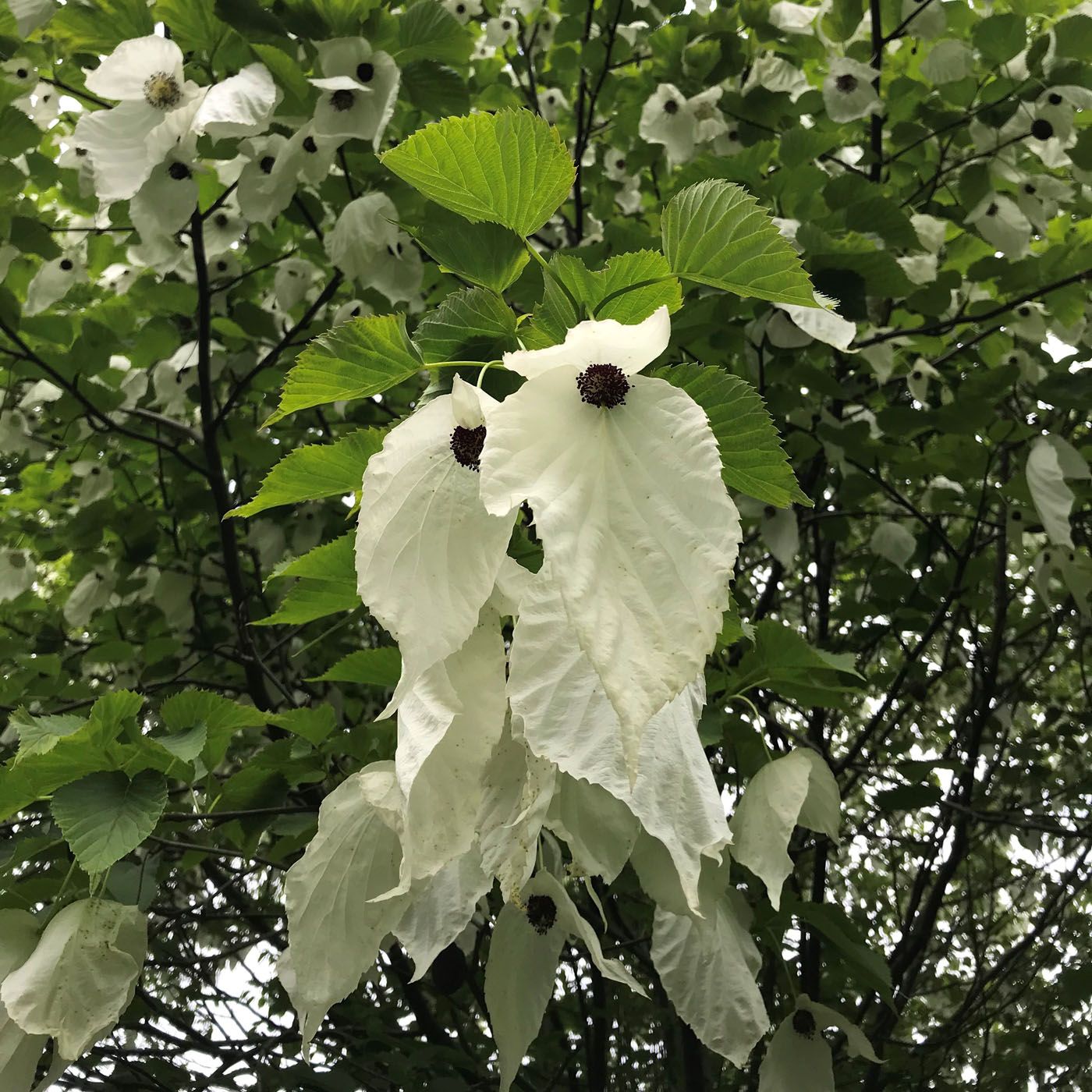 Description: Davidia inv 'Columnar' is a special dove tree selection of columnar habit and compact growth that flowers at a young age, producing beautiful large white flower bracts in May. Dark-green cordate leaves are the perfect backdrop for the blooms.