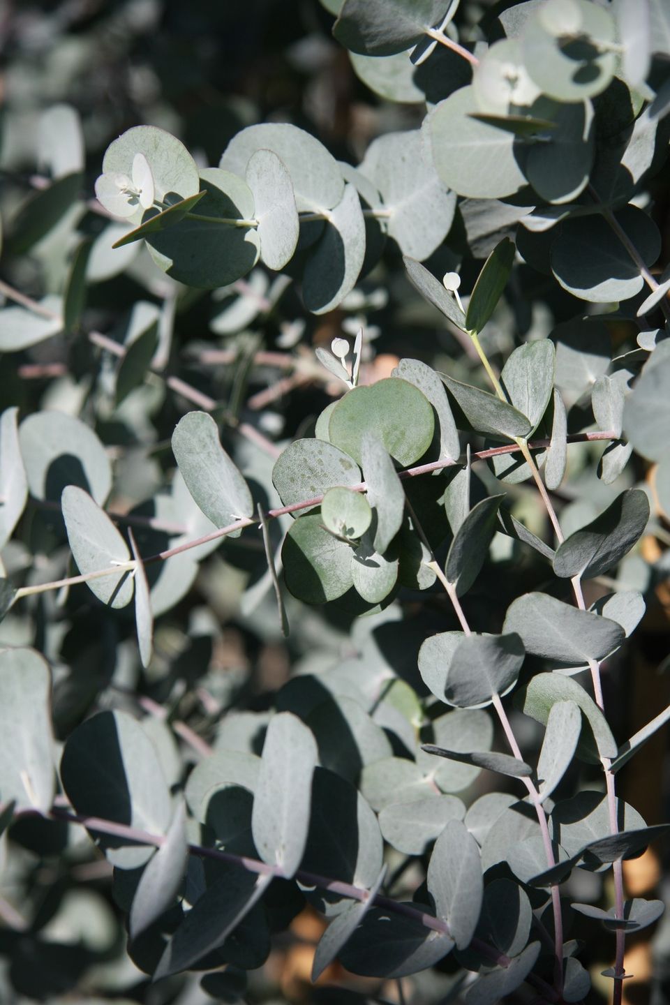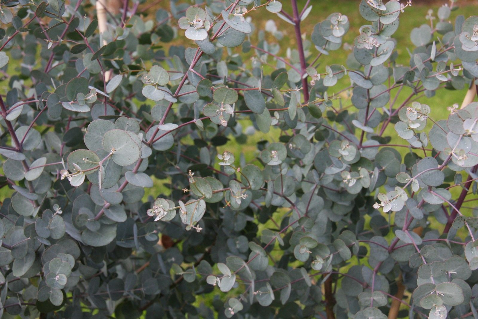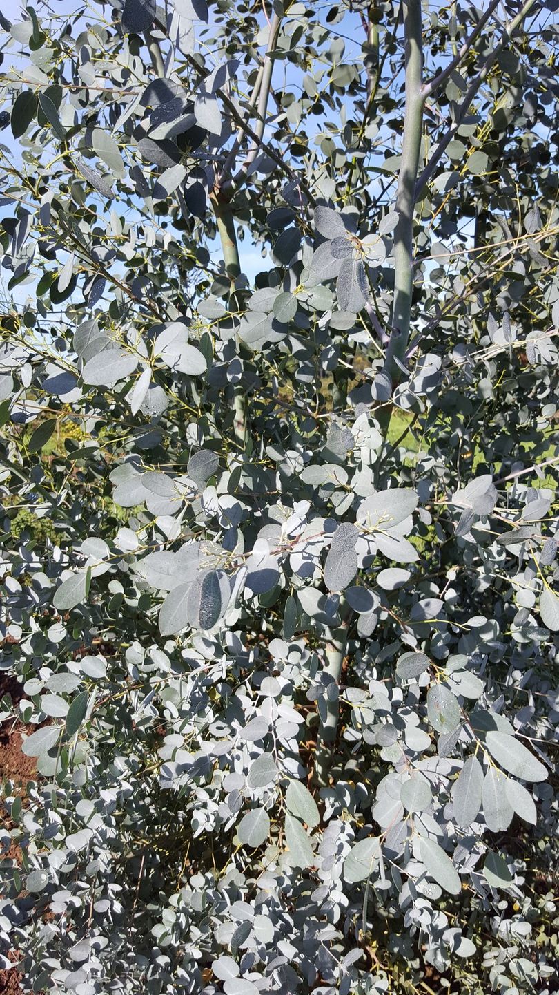 Peeling grey/brown bark. Glaucous leaves in pairs which 'spin'. Older leaves turn purple then blue-green.