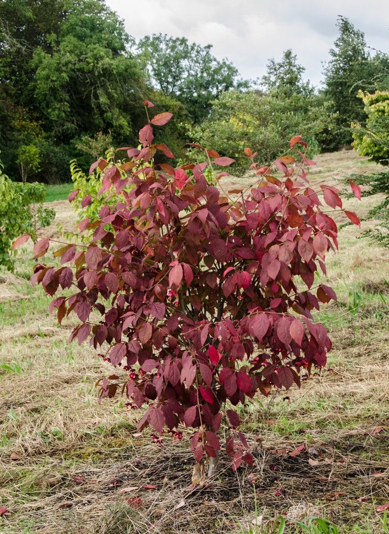 Small tree with an arching habit. White fruits in autumn split to reveal bright red seeds. Lemon yellow autumn foliage.