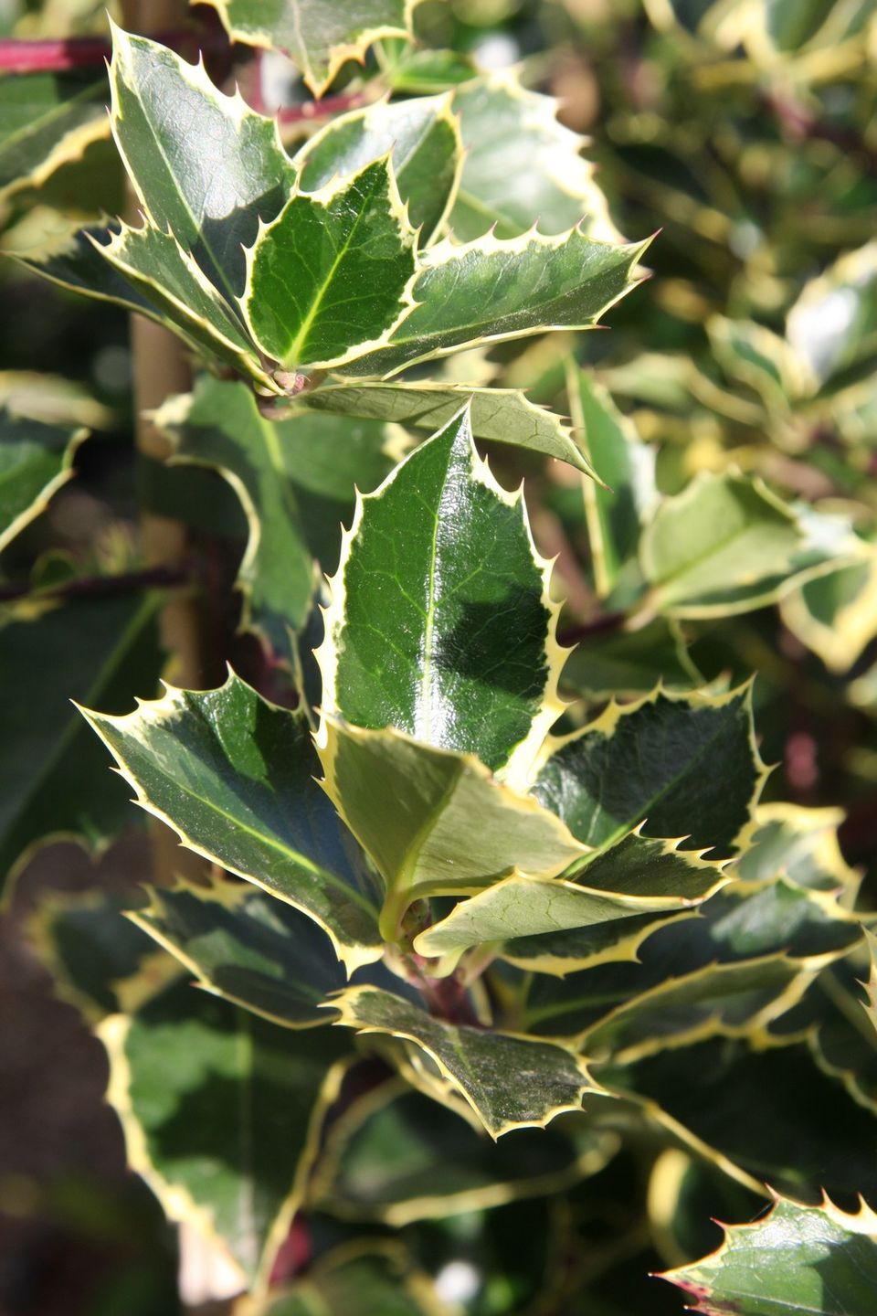 Description: Ilex aqu Argentea Marginata - This stunning variety produces masses of glossy green, prickly foliage that has creamy edges, tinged pink. Its bright red berries, on pollinated female plants, provide food for native birds throughout the winter and it can be trimmed into a superb formal decorative hedge.