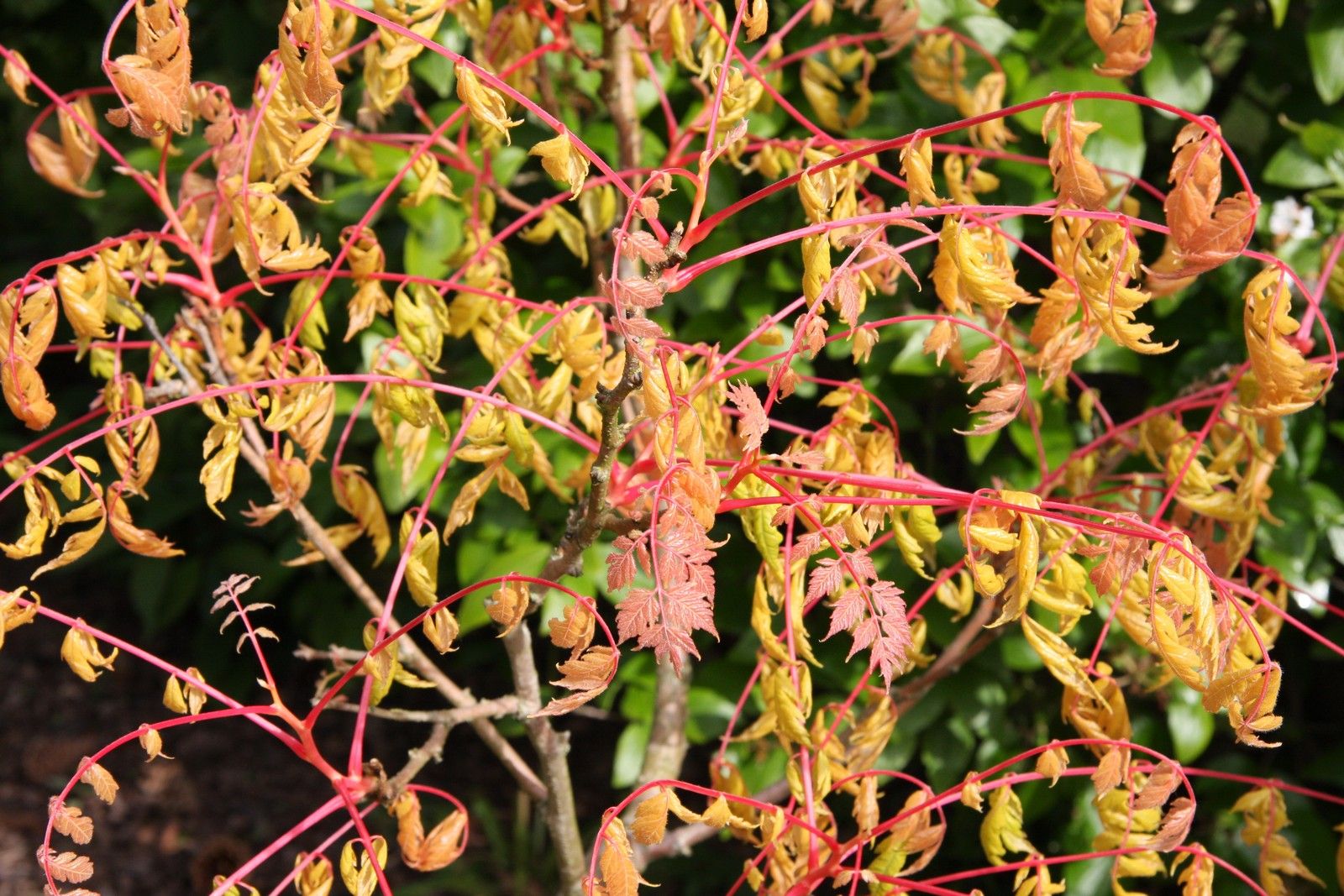 Description: Koelreuteria 'Coral Sun' is a small to medium size tree with a rather irregular round to fan shaped crown. It produces striking, coral red shoots and leaves in the spring, the almost fern like foliage turns lush green throughout the summer with the stems often keeping their red colouration. Large, conical panicles of yellow flowers appear in summer attracting many pollinators, followed by bladder like, green fruit ripening red or coral pink. In a good, crisp autumn the leaves can turn glorious shades of yellow and orange before falling.
