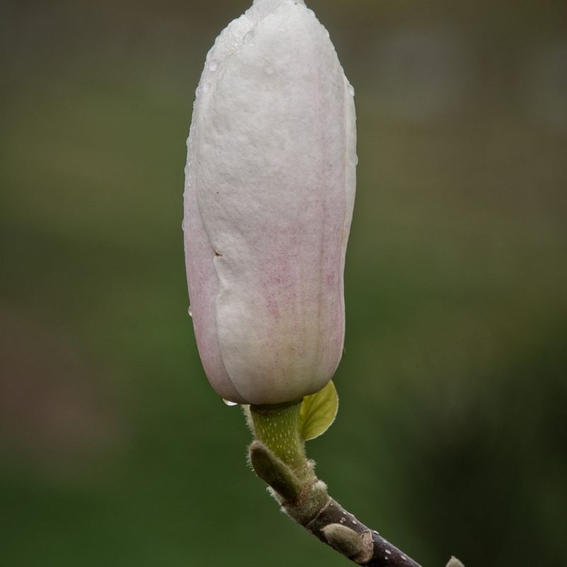 One of the purest white Magnolias, cup shaped, with soft rose pink stamens and pale green anthers.
