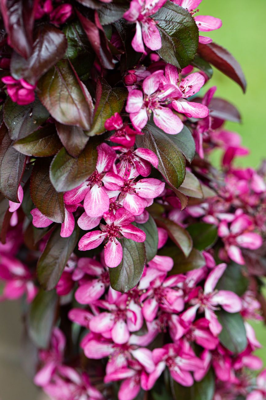 Description: Malus 'Laura'® or Crab Apple Laura is a naturally dwarf tree with an upright habit, for even the smallest garden. Dark purple-green leaves and stunning pink and white flowers in April. Persistent large, round, maroon fruit perfect for the best crab apple jelly.