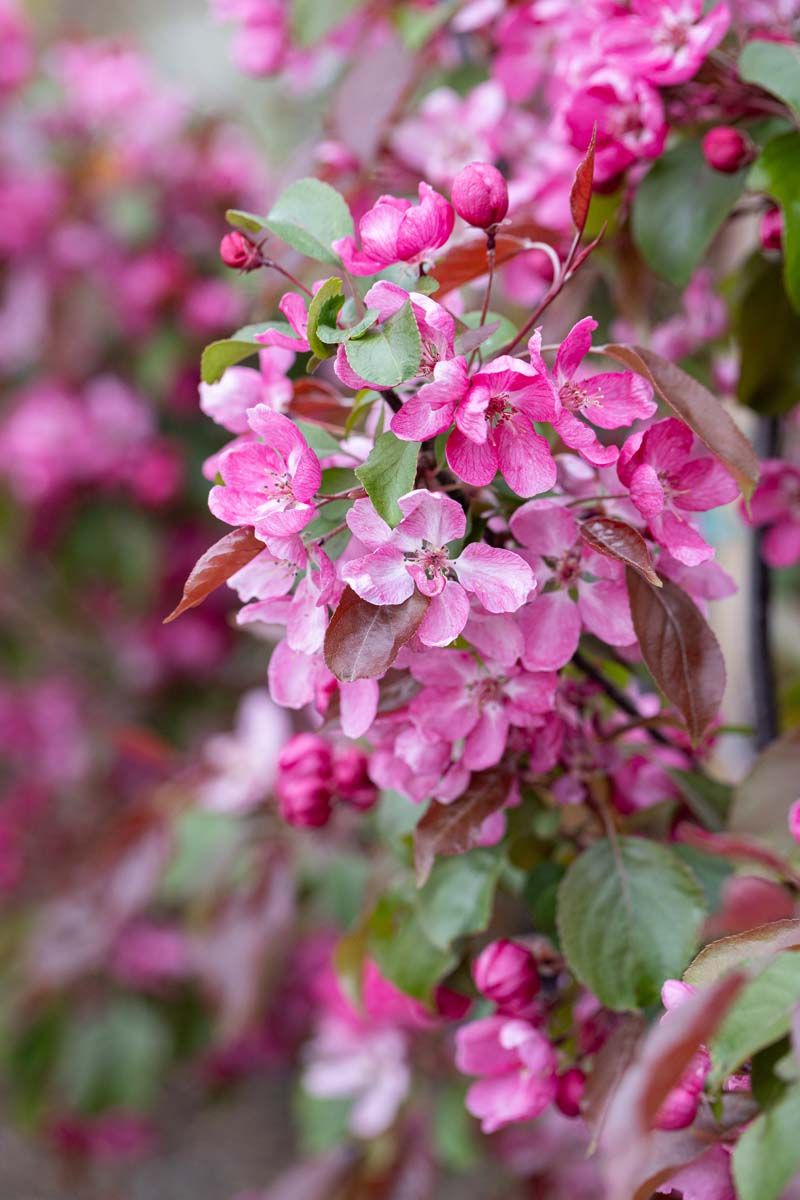 Description: Malus Rudolph is a crab apple, a medium tree of upright habit with glossy bronze-red, later dark bronze-green leaves on red young shoots. Rose red flowers, deeper in bud, followed by long persistent, orange-yellow oblong fruits.