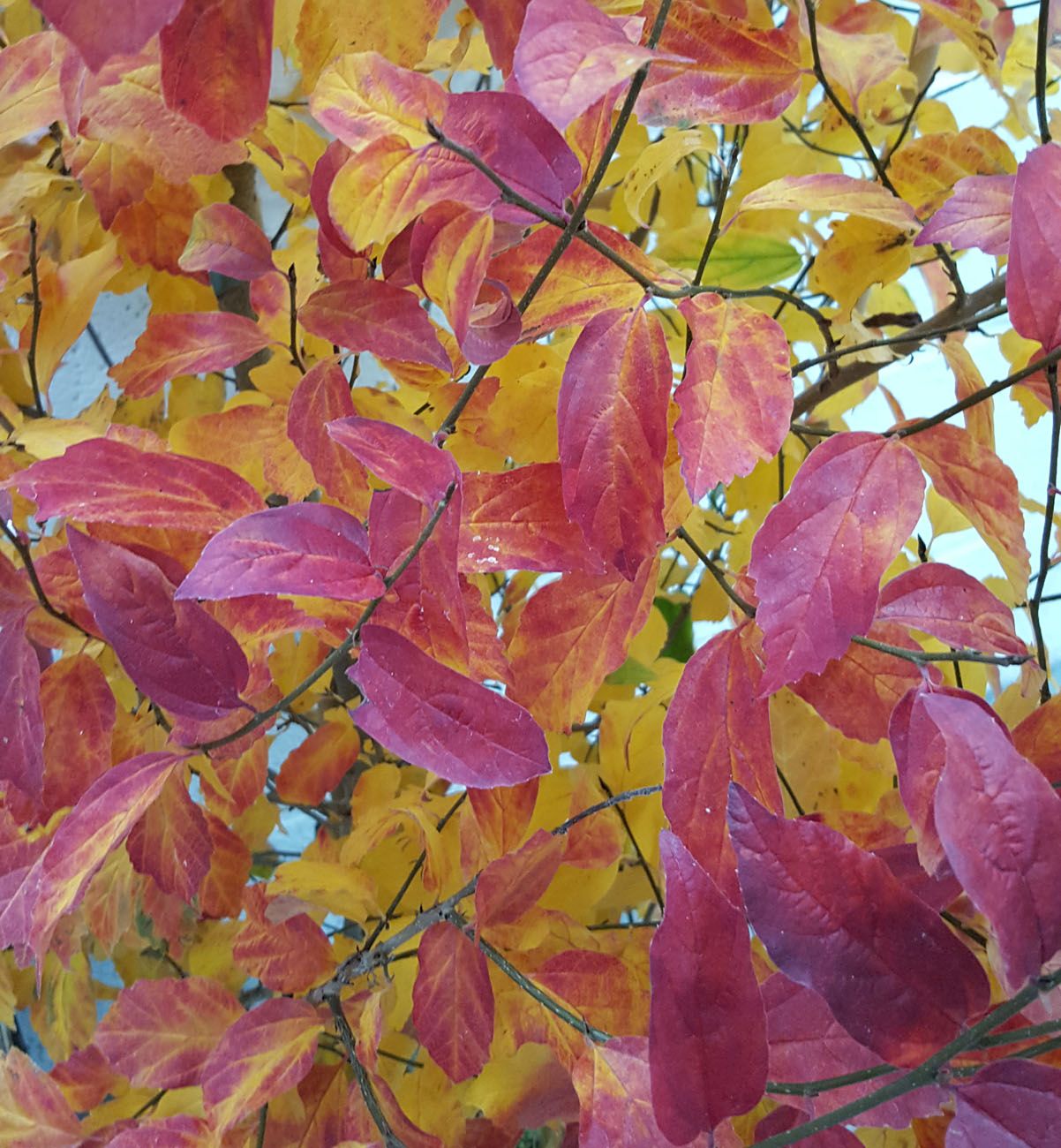A small wide spreading tree. Clusters of crimson-gold stamen and leaves in autumn. Delicate flowers in winter.
