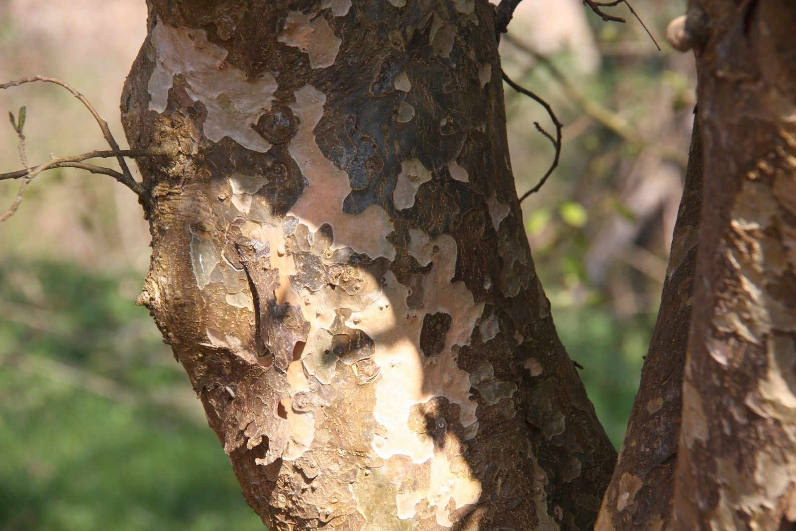 Small upright tree with flaking grey-brown bark. Bronze spring leaves and dark red and purple autumn colours.