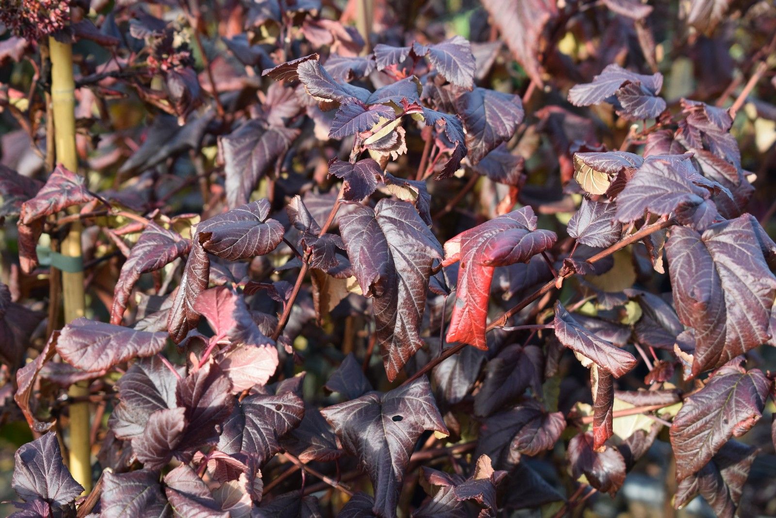 Med sized deciduous shrub with large, lobed, orange-purple leaves. Produces dense round heads of tiny pink flowers. Read more