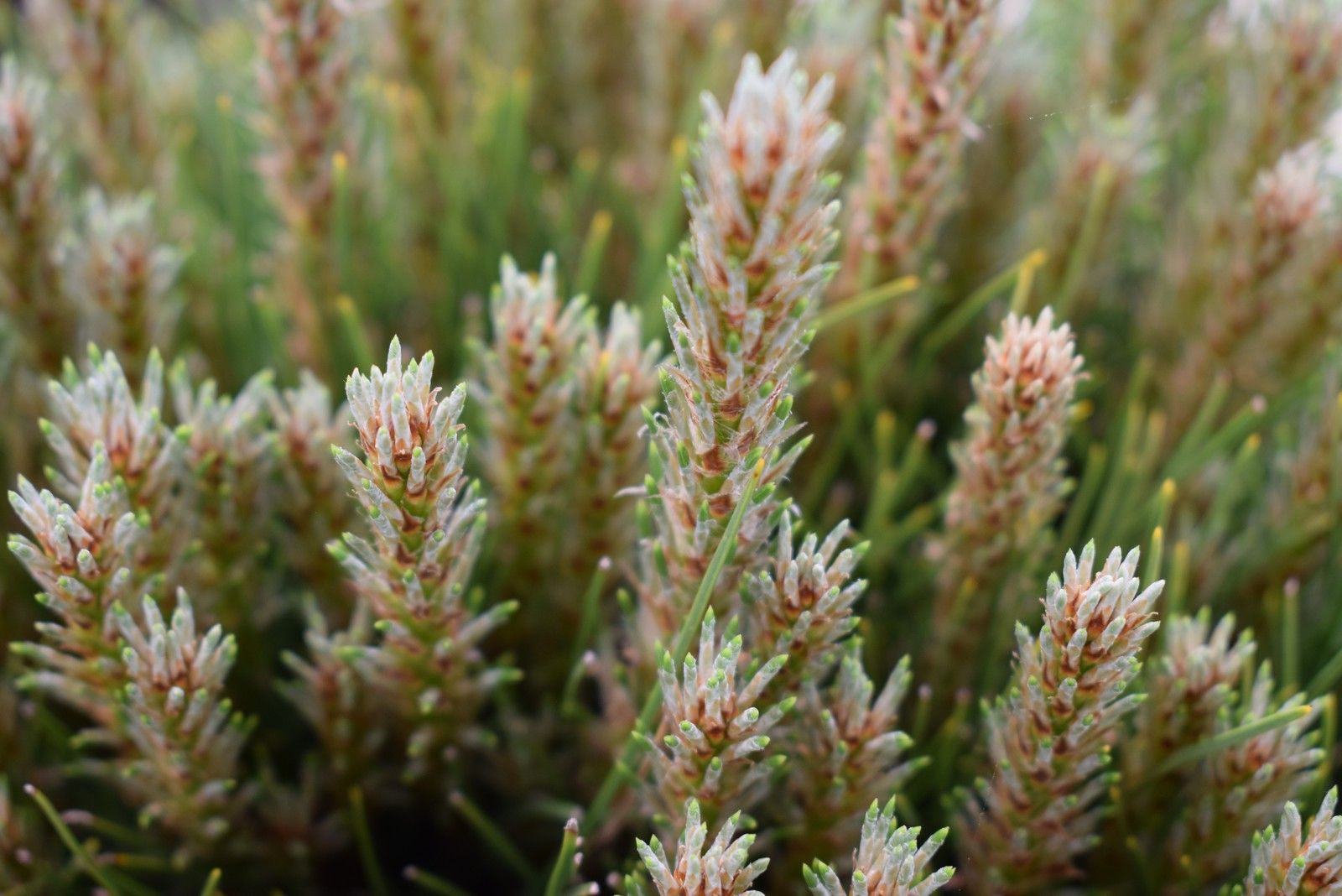 A very small irregular and slow growing plant with little short light green needles, and lots of small side shoots and buds.