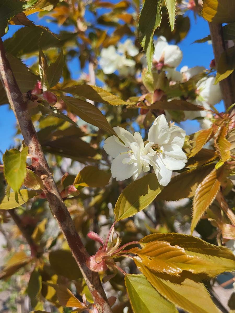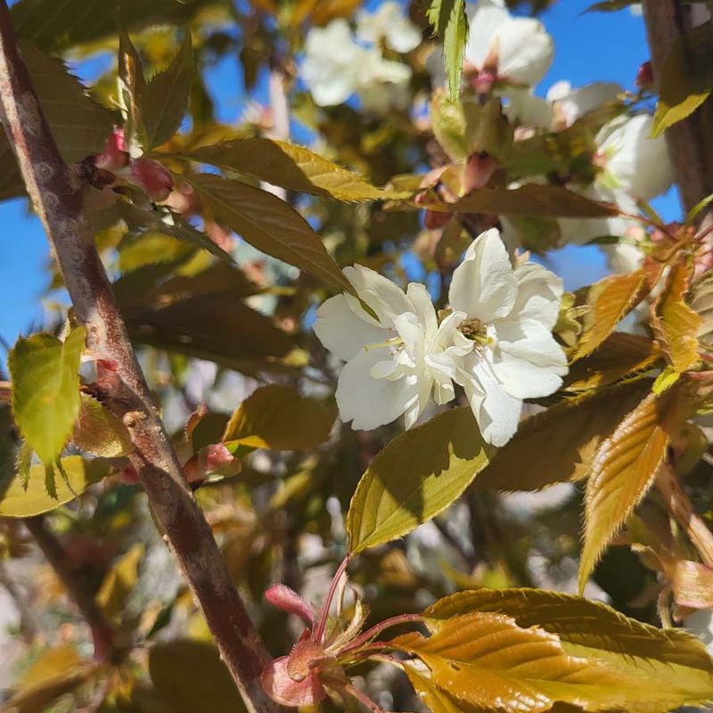 Winter flowering form with white flowers from pink buds. Strongly toothed leaves turn red-orange in autumn.