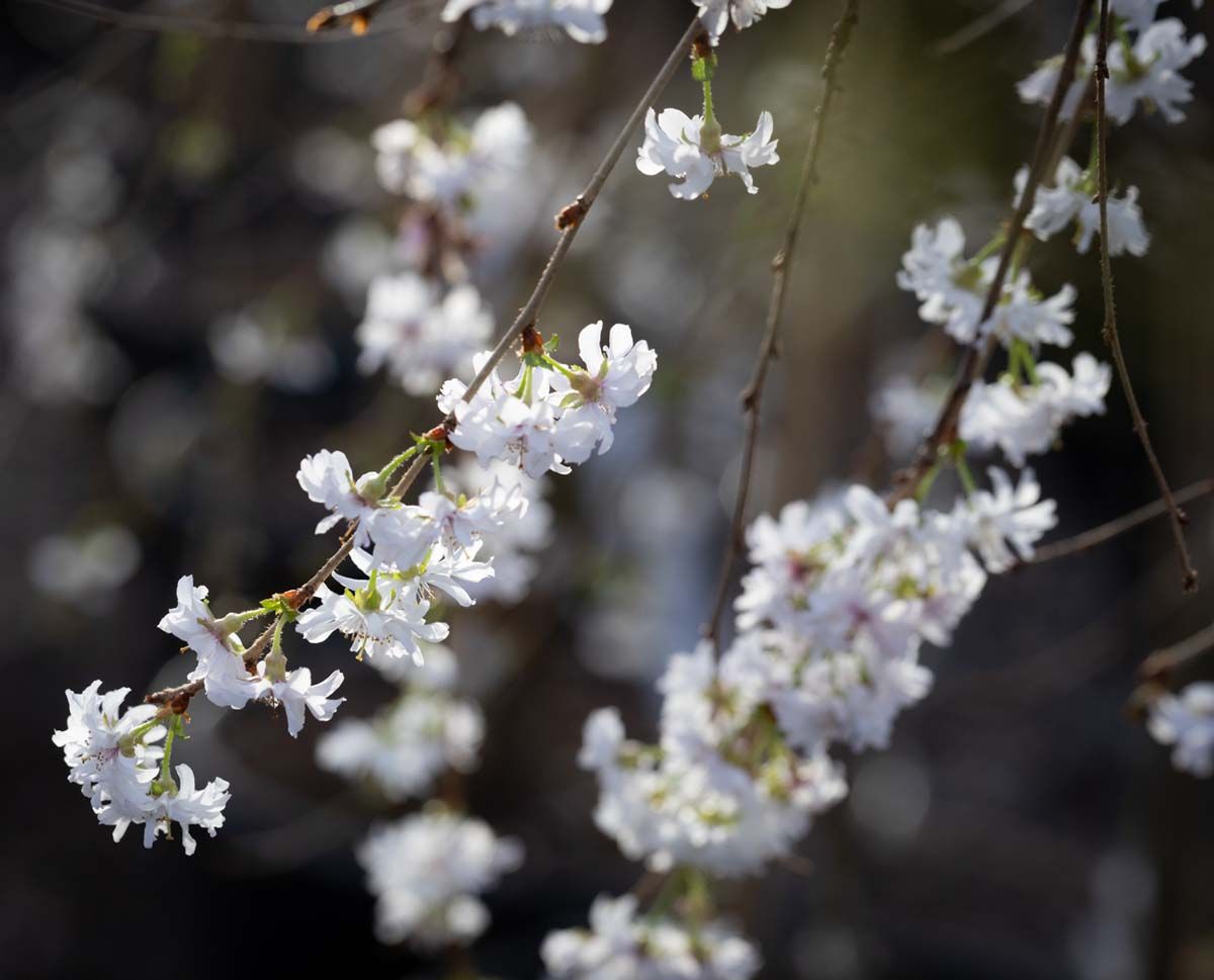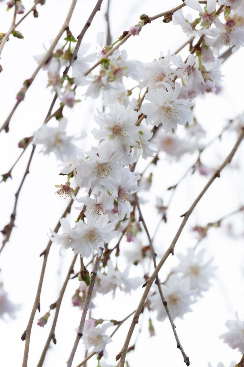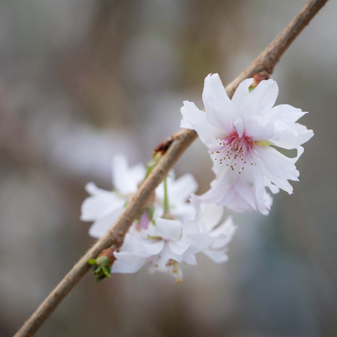 Weeping, winter flowering Cherry with unique densely double, dainty, white flowers Read more