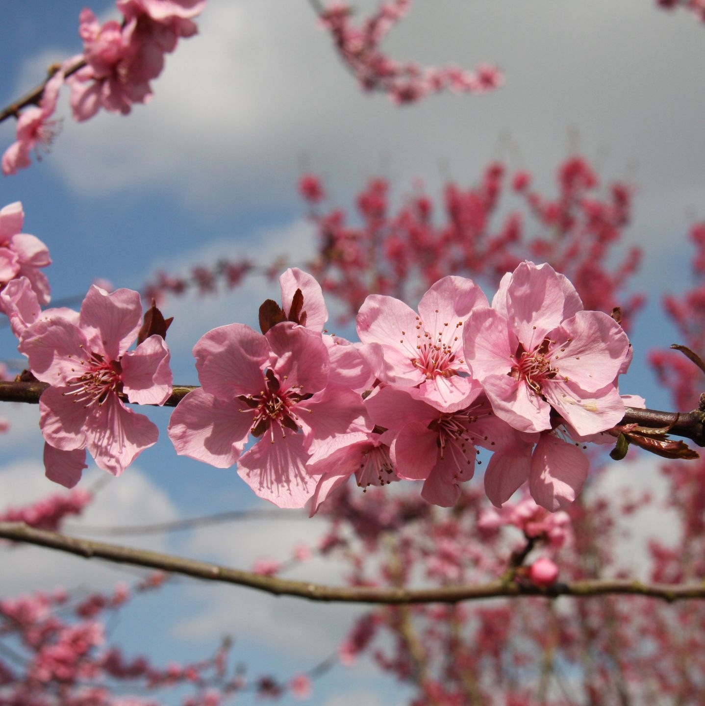 Description: Prunus x persicoides 'Spring Glow' is an upright, deciduous tree with lance-shaped, tapered, persistent bronze leaves. Long lasting saucer-shaped, pink flowers appear on bare, dark purple branches in spring.