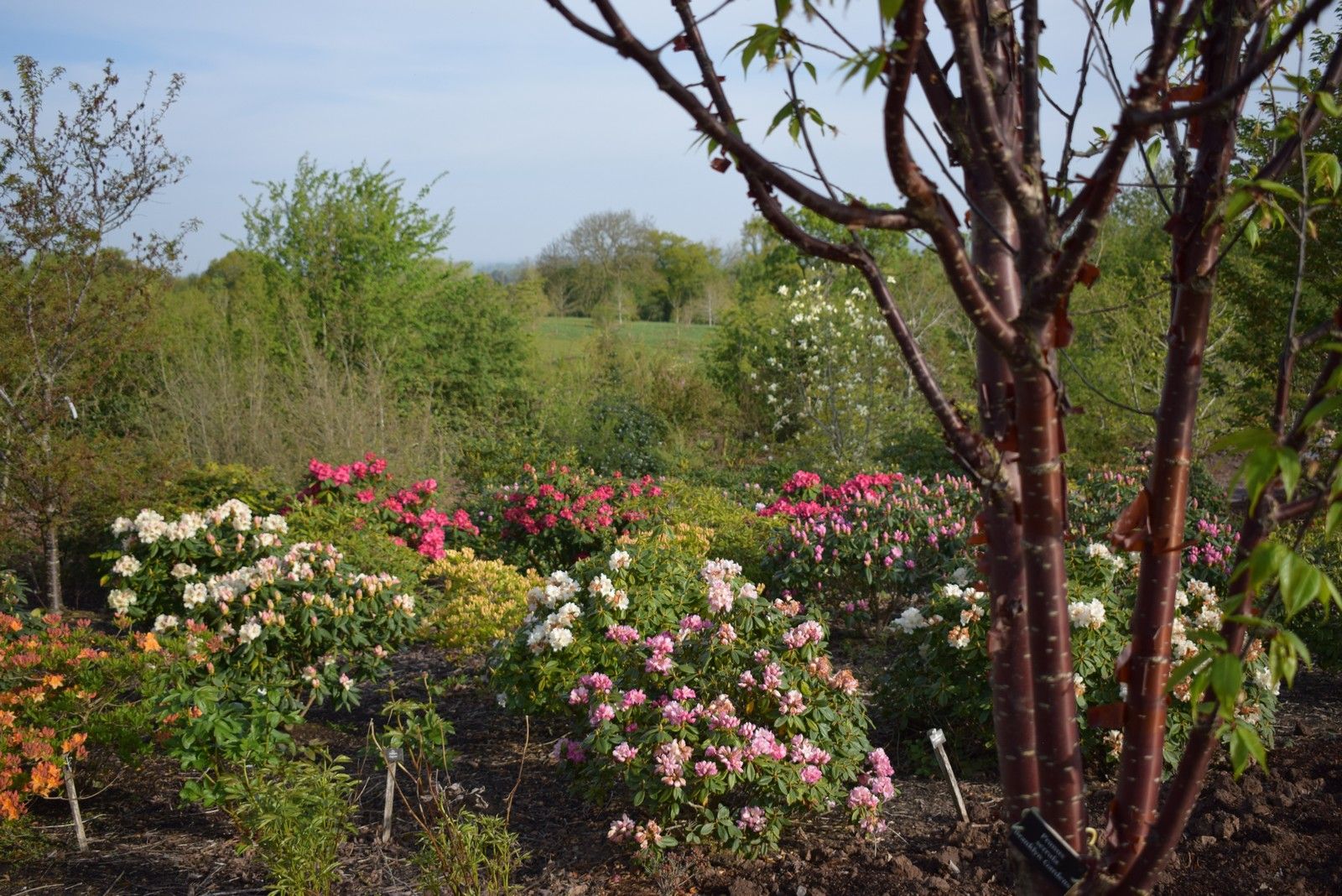 Ascending branches and double shell pink flowers against bronze/green leaves in mid April.