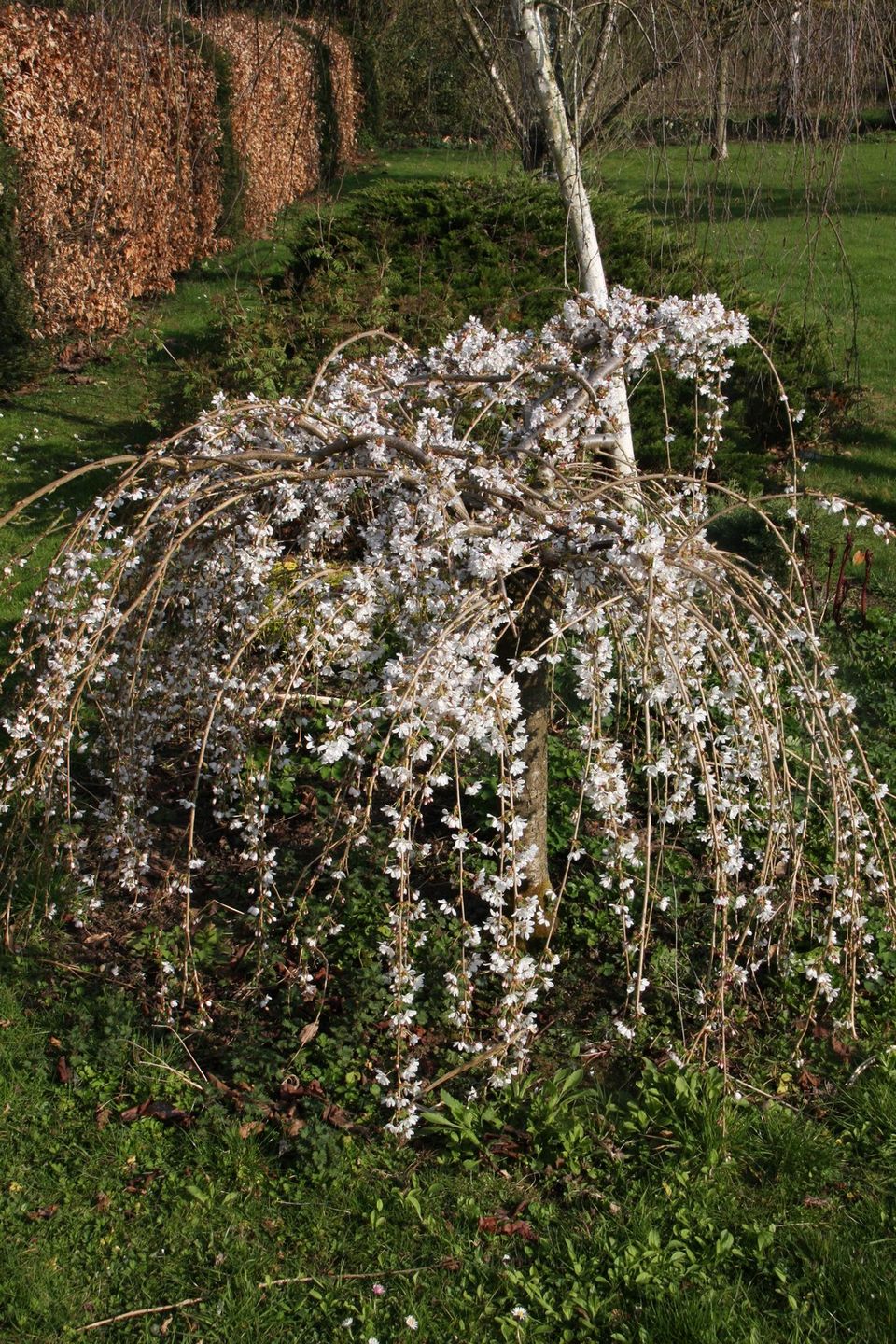 Description: Prunus Snow Showers is a small, neat, steeply weeping, ornamental tree with mid-green foliage, turning bright shades of orange, yellow and red in the autumn. Dense single white flowers cover the steeply pendent branches in late March. A very useful compact tree that will serve well in a small space.