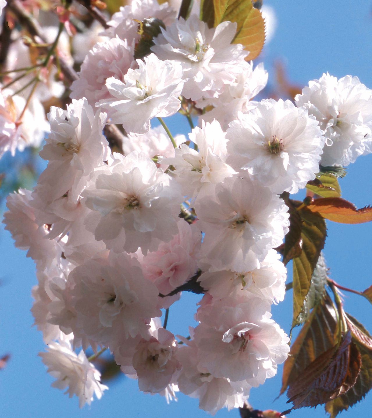 Description: Prunus 'Spring Snow' is a compact, deciduous tree, vase shaped when young, maturing to a spreading tree. The ovate to elliptic leaves open a bronze tinted green and turn shades of orange and red in autumn. Clusters of blush white, double flowers appear like dustings of snow on the bare branches.