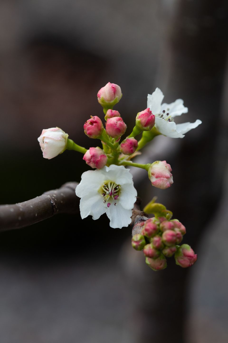 White blossom in spring, followed by small, edible fruit. Leaves turn gold and orange in autumn.