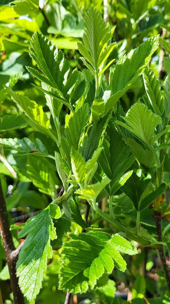 Description: Sorbus arranensis is large shrub or small upright tree also know as The Scottish or Arran Whitebeam. It has ovate leaves which are deeply lobed, green above and grey and downy underneath. White, delicate flowers in the spring which are followed by round-long berries in the autumn. A great natural bird feeder.
