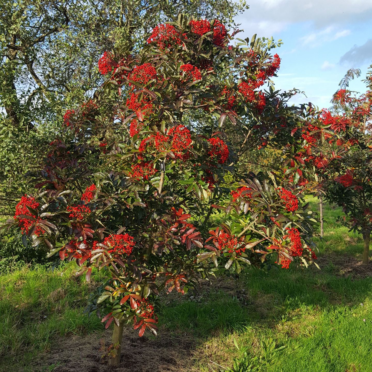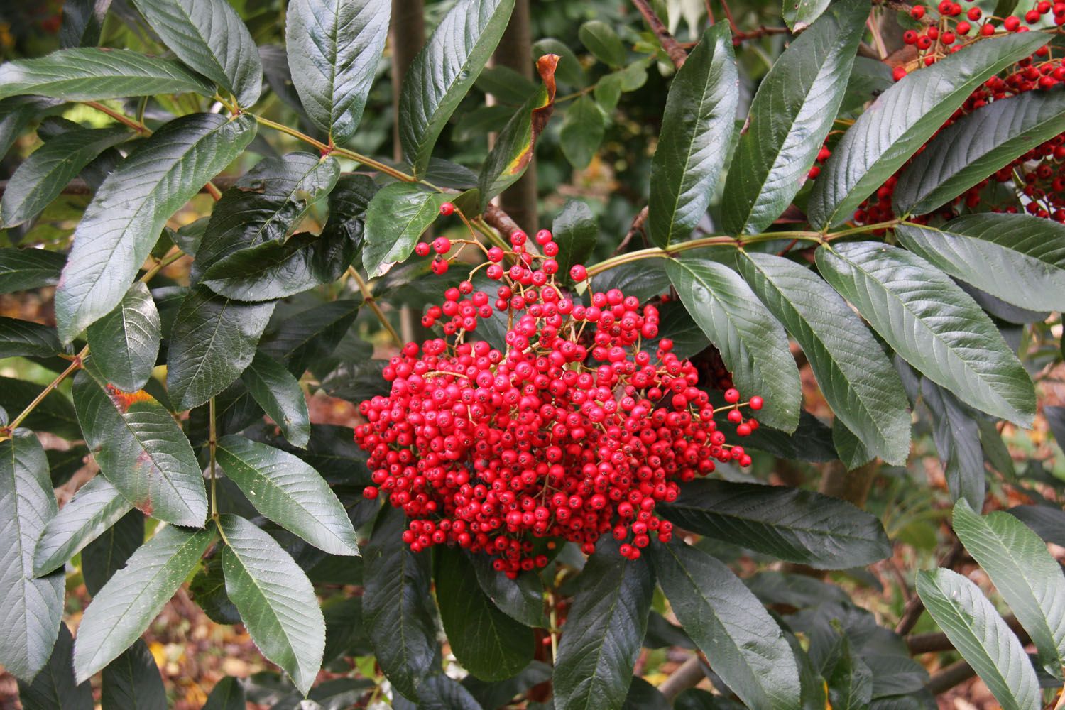 Blueish green, pinnate leaves turn vivid red in autumn. Clusters of pink tinged white fruit in abundance.